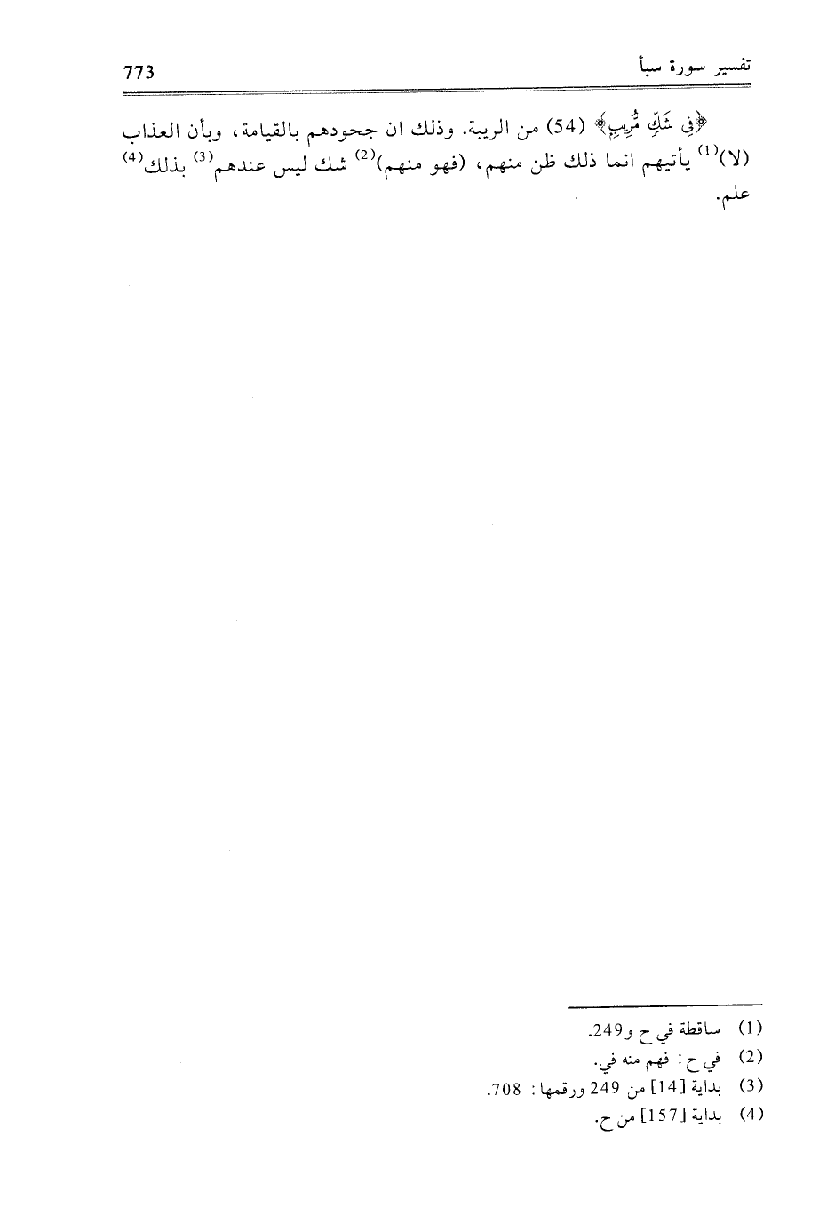 {فِي شَكٍّ مُرِيبٍ} [سبأ: 54] مِنَ الرِّيبَةِ وَذَلِكَ أَنَّ جُحُودَهُمْ بِالْقِيَامَةِ، وَبِأَنَّ الْعَذَابَ لا يَأْتِيهِمْ إِنَّمَا ظَنٌّ مِنْهُمْ، فَهُوَ مِنْهُمْ شَكٌّ لَيْسَ عِنْدَهُمْ بِذَلِكَ عِلْمٌ.