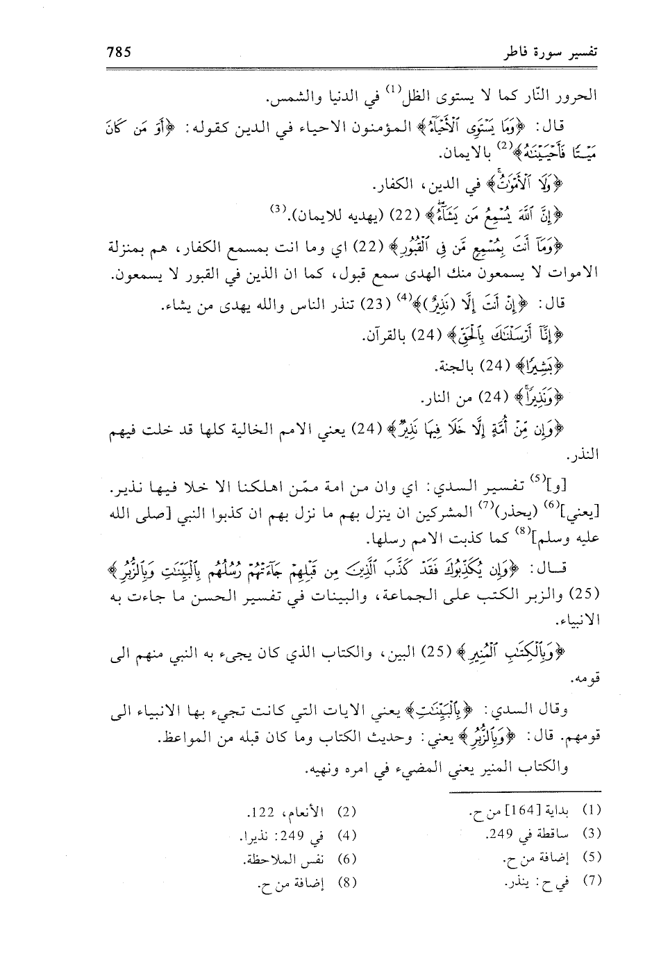 {وَبِالْكِتَابِ الْمُنِيرِ} [فاطر: 25] الْبَيِّنِ، وَالْكِتَابِ الَّذِي كَانَ يَجِيءُ بِهِ النَّبِيُّ مِنْهُمْ إِلَى قَوْمِهِ.