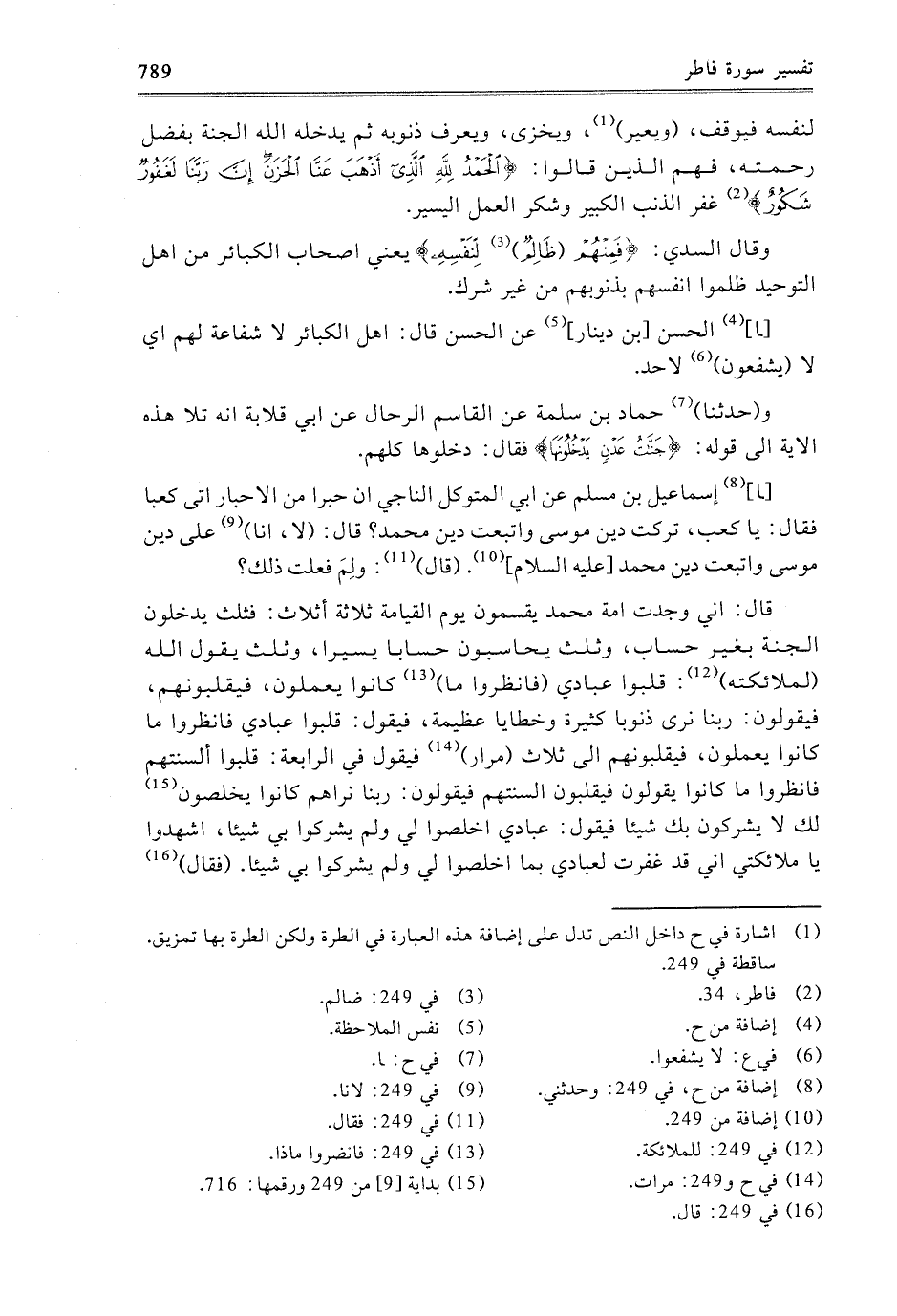 لِنَفْسِهِ فَيُوقَفُ، وَيُعَيَّرُ، وَيُخْزَى، وَيُعْرَفُ ذُنُوبُهُ ثُمَّ يُدْخِلُهُ اللَّهُ الْجَنَّةَ بِفَضْلِ رَحْمَتِهِ، فَهُمُ الَّذِينَ قَالُوا: {الْحَمْدُ لِلَّهِ الَّذِي أَذْهَبَ عَنَّا الْحَزَنَ إِنَّ رَبَّنَا لَغَفُورٌ شَكُورٌ} [فاطر: 34] غَفَرَ الذَّنْبَ الْكَبِيرَ وَشَكَرَ الْعَمَلَ الْيَسِيرَ.