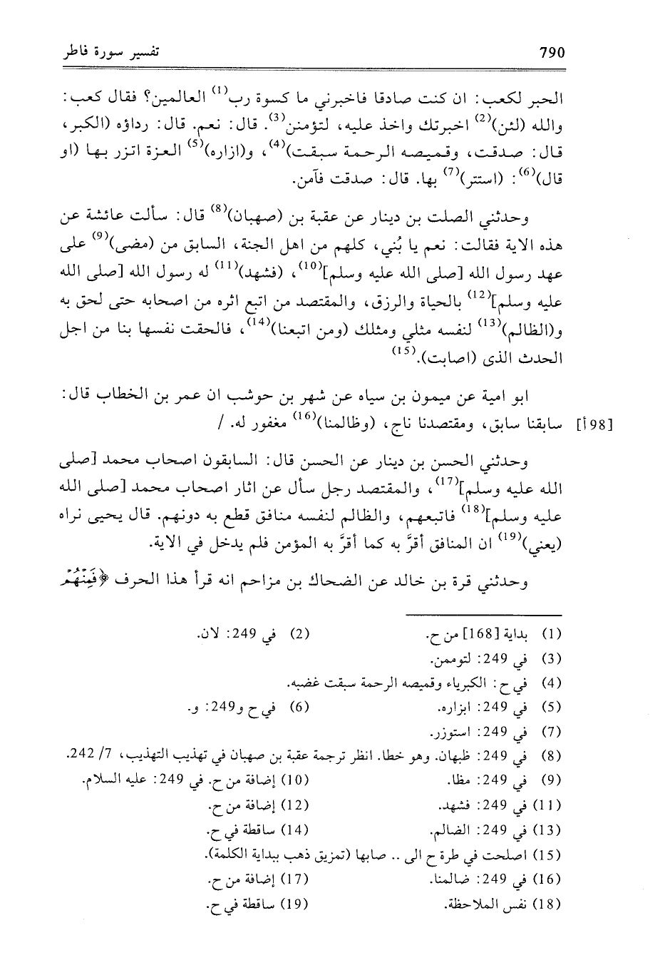 - وَحَدَّثَنِي الصَّلْتُ بْنُ دِينَارٍ، عَنْ عُقْبَةَ بْنِ صَهْبَانَ، قَالَ: سَأَلْتُ عَائِشَةَ عَنْ هَذِهِ الآيَةِ فَقَالَتْ: نَعَمْ يَا بُنَيَّ، كُلُّهُمْ مِنْ أَهْلِ الْجَنَّةِ، السَّابِقُ مَنْ مَضَى عَلَى عَهْدِ رَسُولِ اللَّهِ صَلَّى اللَّهُ عَلَيْهِ وَسَلَّمَ، فَشَهِدَ لَهُ رَسُولُ اللَّهِ صَلَّى اللَّهُ عَلَيْهِ وَسَلَّمَ بِالْحَيَاةِ وَالرِّزْقِ، وَالْمُقْتَصِدُ مَنِ اتَّبَعَ أَثَرَهُ مِنْ أَصْحَابِهِ حَتَّى لَحِقَ بِهِ، وَالظَّالِمُ لِنَفْسِهِ مِثْلِي وَمِثْلُكَ وَمَنِ اتَّبَعَنَا، فَأَلْحَقَتْ نَفْسَهَا بِنَا مِنْ أَجْلِ