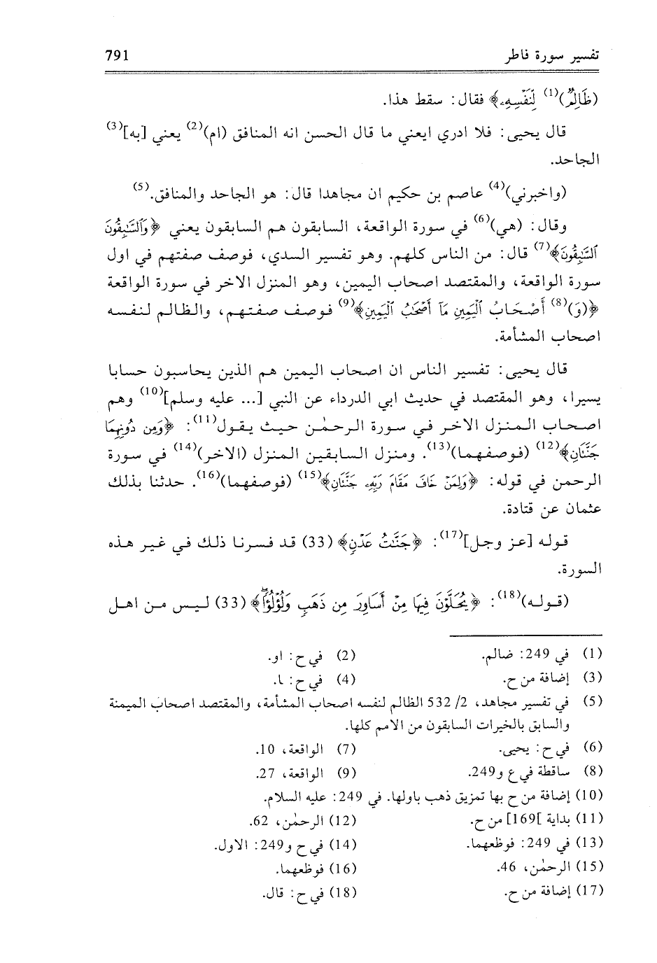 قَالَ يَحْيَى: تَفْسِيرُ النَّاسِ أَنَّ أَصْحَابَ الْيَمِينِ هُمُ الَّذِينَ يُحَاسَبُونَ حِسَابًا يَسِيرًا، وَهُوَ الْمُقْتَصِدُ فِي حَدِيثِ أَبِي الدَّرْدَاءِ عَنِ النَّبِيِّ صَلَّى اللَّهُ عَلَيْهِ وَسَلَّمَ: وَهُمْ أَصْحَابُ الْمَنْزِلِ الآخَرِ فِي سُورَةِ الرَّحْمَنِ حَيْثُ يَقُولُ: {وَمِنْ دُونِهِمَا جَنَّتَانِ} [الرحمن: 62] فَوَصَفَهُمَا وَمَنْزِلُ السَّابِقِينَ الْمَنْزِلُ الآخَرُ فِي سُورَةِ الرَّحْمَنِ فِي قَوْلِهِ: {وَلِمَنْ خَافَ مَقَامَ رَبِّهِ جَنَّتَانِ} [الرحمن: 46] فَوَصَفَهُمَا، حَدَّثَنَا بِذَلِكَ عُثْمَانُ، عَنْ قَتَادَةَ.