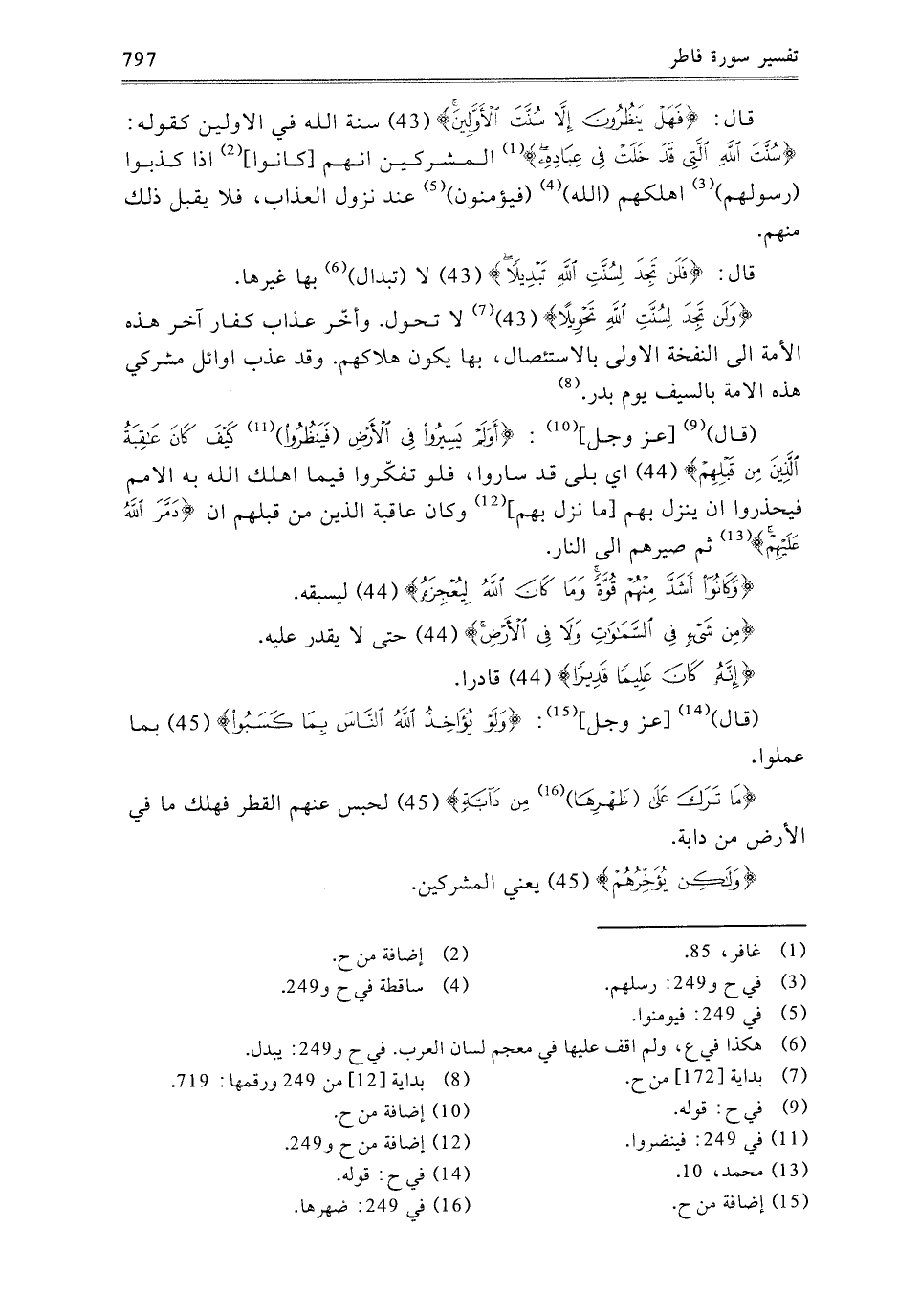 {وَلَنْ تَجِدَ لِسُنَّةِ اللَّهِ تَحْوِيلا} [فاطر: 43] لا تُحَوَّلُ وَآخِرُ عَذَابِ كُفَّارِ آخِرِ هَذِهِ الأُمَّةِ إِلَى النَّفْخَةِ الأُولَى بِالاسْتِئْصَالِ، بِهَا يَكُونُ هَلاكُهُمْ، وَقَدْ عُذِّبَ أَوَائِلُ مُشْرِكِي هَذِهِ الأُمَّةِ بِالسَّيْفِ يَوْمَ بَدْرٍ.