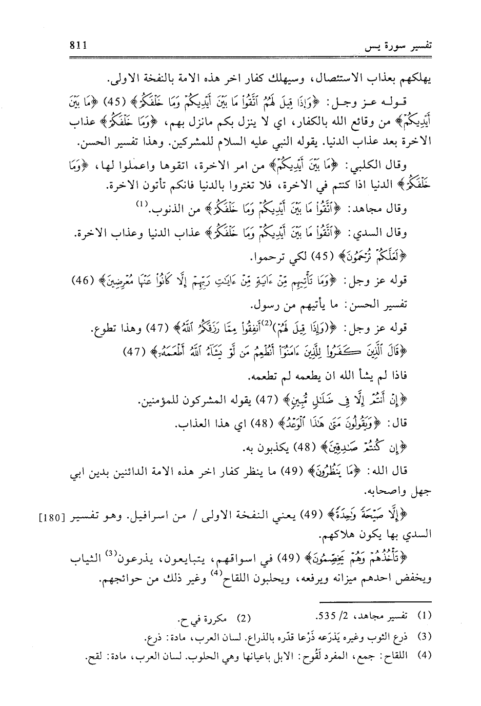 قَوْلُهُ عَزَّ وَجَلَّ: {وَإِذَا قِيلَ لَهُمُ اتَّقُوا مَا بَيْنَ أَيْدِيكُمْ وَمَا خَلْفَكُمْ} [يس: 45] ، {مَا بَيْنَ أَيْدِيكُمْ} [يس: 45] مِنْ وَقَائِعِ اللَّهِ بِالْكُفَّارِ، أَيْ: لا يَنْزِلُ بِكُمْ مَا نَزَلَ بِهِمْ، {وَمَا خَلْفَكُمْ} [يس: 45] عَذَابُ الآخِرَةِ بَعْدَ عَذَابِ الدُّنْيَا يَقُولُهُ النَّبِيُّ عَلَيْهِ السَّلامُ لِلْمُشْرِكِينَ، وَهَذَا تَفْسِيرُ الْحَسَنِ.