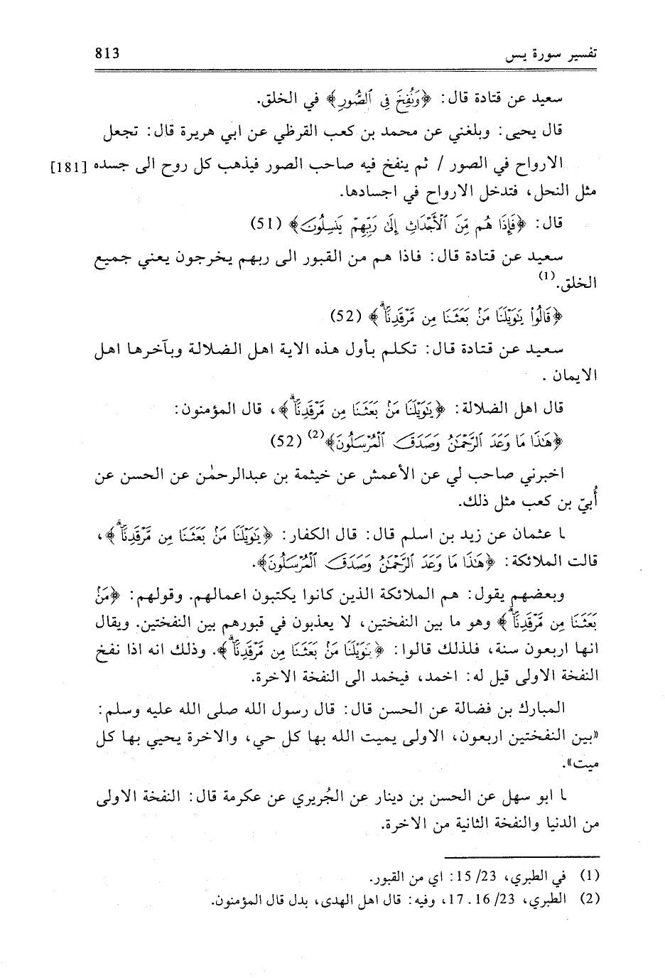 {قَالُوا يَا وَيْلَنَا مَنْ بَعَثَنَا مِنْ مَرْقَدِنَا} [يس: 52] سَعِيدٌ، عَنْ قَتَادَةَ، قَالَ: تَكَلَّمَ بِأَوَّلِ هَذِهِ الآيَةِ أَهْلُ الضَّلالَةِ وَبِآخِرِهَا أَهْلُ الإِيمَانِ.