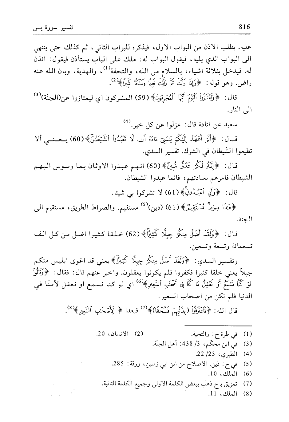 وَتَفْسِيرُ السُّدِّيُّ: {وَلَقَدْ أَضَلَّ مِنْكُمْ جِبِلا كَثِيرًا} [يس: 62] ، يَعْنِي: قَدْ أَغْوَى إِبْلِيسُ مِنْكُمْ جِبِلا، يَعْنِي: خَلْقًا كَثِيرًا، فَكَفَرُوا فَلَمْ يَكُونُوا يَعْقِلُونَ، وَأَخْبَرَ عَنْهُمْ قَالَ: فَقَالَ: {وَقَالُوا لَوْ كُنَّا نَسْمَعُ أَوْ نَعْقِلُ مَا كُنَّا فِي أَصْحَابِ السَّعِيرِ} [الملك: 10] ، أَيْ: لَوْ كُنَّا نَسْمَعُ أَوْ نَعْقِلُ لآمَنَّا فِي الدُّنْيَا، فَلَمْ نَكُنْ مِنْ أَصْحَابِ السَّعِيرِ.