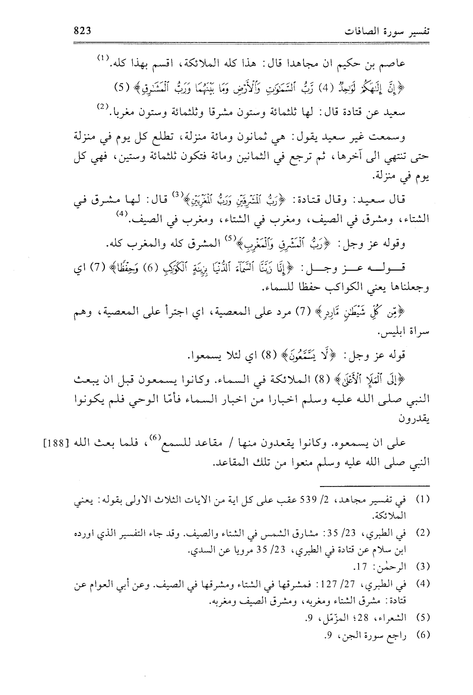 قَوْلُهُ عَزَّ وَجَلَّ: {إِنَّا زَيَّنَّا السَّمَاءَ الدُّنْيَا بِزِينَةٍ الْكَوَاكِبِ {6} وَحِفْظًا} [الصافات: 6-7] ، أَيْ: وَجَعْلَنَاهَا، يَعْنِي: الْكَوَاكِبَ حِفْظًا لِلسَّمَاءِ.