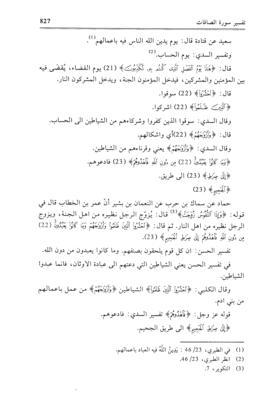 - حَمَّادٌ، عَنْ سِمَاكِ بْنِ حَرْبٍ، عَنِ النُّعْمَانِ بْنِ بَشِيرٍ، أَنَّ عُمَرَ بْنَ الْخَطَّابِ قَالَ فِي قَوْلِهِ: {وَإِذَا النُّفُوسُ زُوِّجَتْ} [التكوير: 7] قَالَ: يُزَوَّجُ الرَّجُلُ نَظِيرَهُ مِنْ أَهْلِ الْجَنَّةِ، وَيُزَوَّجُ الرَّجُلُ نَظِيرَهُ مِنْ أَهْلِ النَّارِ، ثُمَّ قَالَ: {احْشُرُوا الَّذِينَ ظَلَمُوا وَأَزْوَاجَهُمْ وَمَا كَانُوا يَعْبُدُونَ {22} مِنْ دُونِ اللَّهِ فَاهْدُوهُمْ إِلَى صِرَاطِ الْجَحِيمِ {23} } [الصافات: 22-23] .