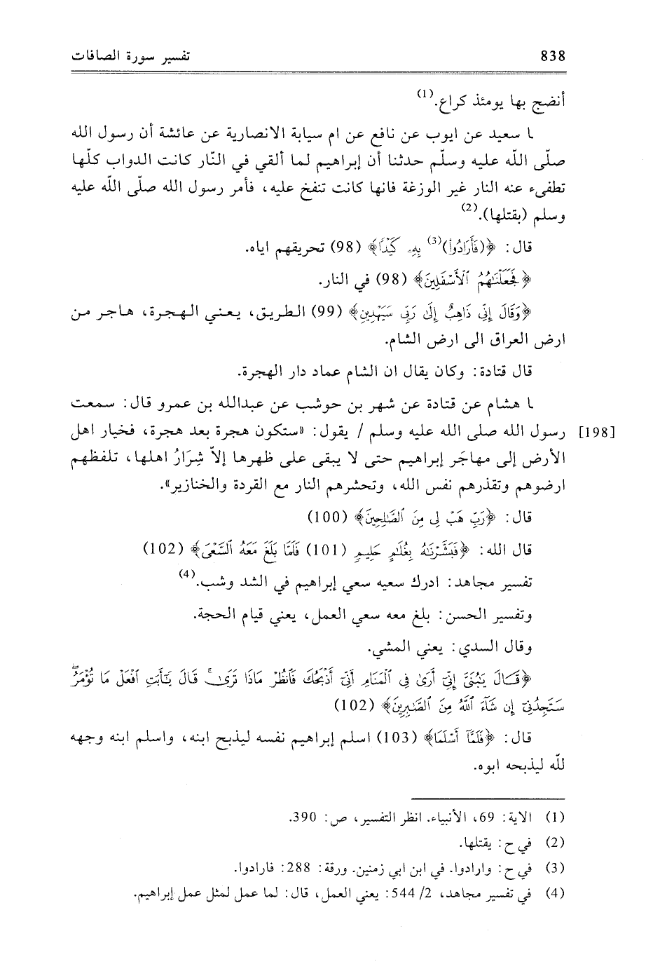 قَالَ: {رَبِّ هَبْ لِي مِنَ الصَّالِحِينَ} [الصافات: 100] قَالَ: {فَبَشَّرْنَاهُ بِغُلامٍ حَلِيمٍ {101} فَلَمَّا بَلَغَ مَعَهُ السَّعْيَ} [الصافات: 101-102] تَفْسِيرُ مُجَاهِدٍ: أَدْرَكَ سَعْيَهُ سَعْيَ إِبْرَاهِيمَ فِي الشَّدِّ وَشَبَّ.