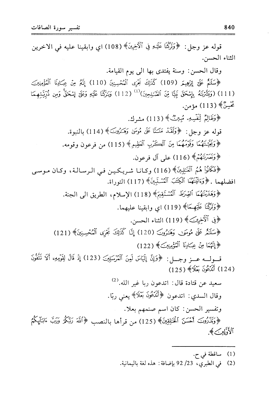 {سَلامٌ عَلَى مُوسَى وَهَارُونَ {120} إِنَّا كَذَلِكَ نَجْزِي الْمُحْسِنِينَ {121} } [الصافات: 120-121] {إِنَّهُمَا مِنْ عِبَادِنَا الْمُؤْمِنِينَ} [الصافات: 122] قَوْلُهُ عَزَّ وَجَلَّ: {وَإِنَّ إِلْيَاسَ لَمِنَ الْمُرْسَلِينَ {123} إِذْ قَالَ لِقَوْمِهِ أَلا تَتَّقُونَ {124} أَتَدْعُونَ بَعْلا} [الصافات: 123-125] سَعِيدٌ، عَنْ قَتَادَةَ، قَالَ: أَتَدْعُونَ رَبًّا غَيْرَ اللَّهِ.