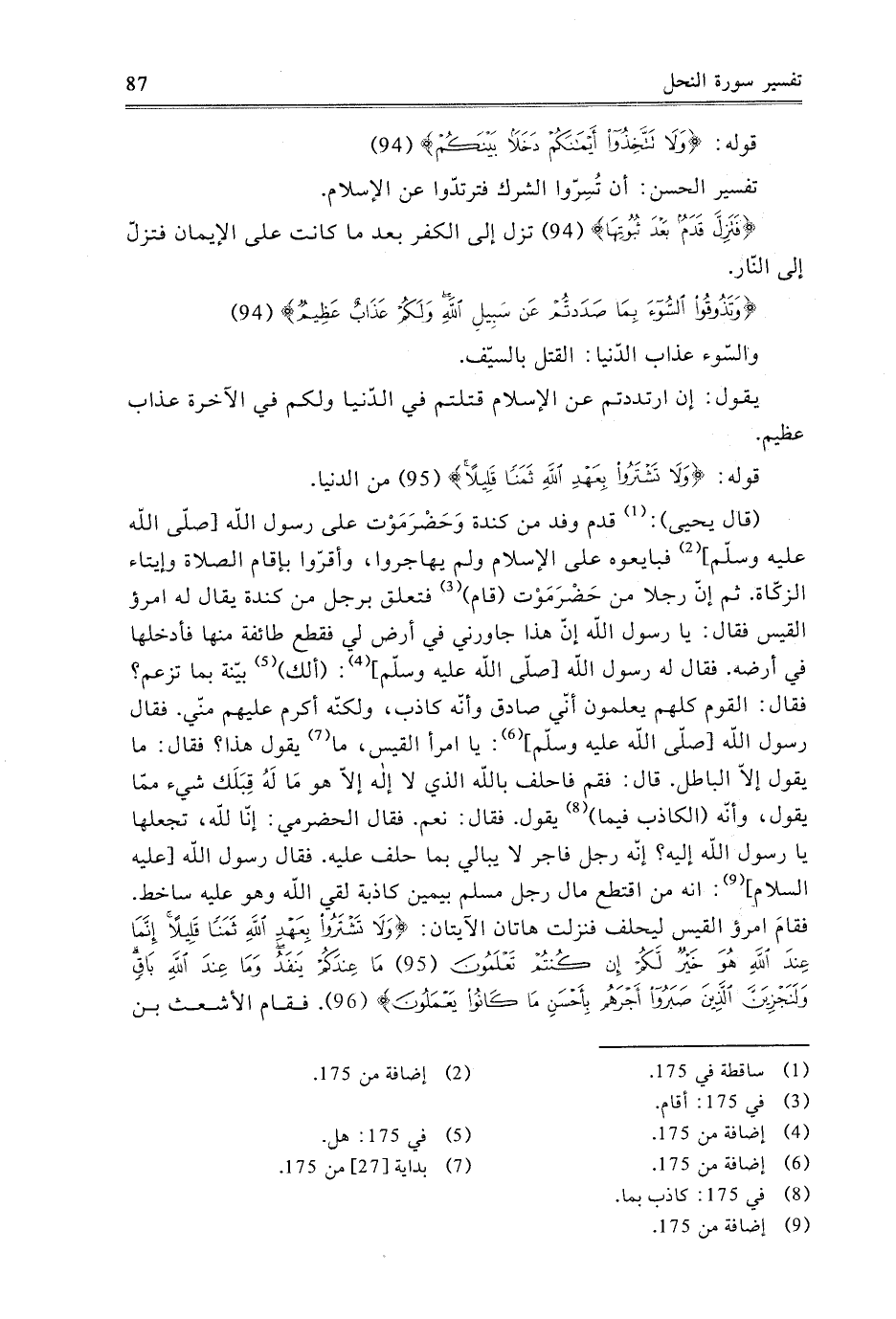 فَقَامَ امْرِؤُ الْقَيْسِ لِيَحْلِفَ، فَنَزَلَتْ هَاتَانِ الآيَتَانِ: {وَلا تَشْتَرُوا بِعَهْدِ اللَّهِ ثَمَنًا قَلِيلا إِنَّمَا عِنْدَ اللَّهِ هُوَ خَيْرٌ لَكُمْ إِنْ كُنْتُمْ تَعْلَمُونَ {95} مَا عِنْدَكُمْ يَنْفَدُ وَمَا عِنْدَ اللَّهِ بَاقٍ وَلَنَجْزِيَنَّ الَّذِينَ صَبَرُوا أَجْرَهُمْ بِأَحْسَنِ مَا كَانُوا يَعْمَلُونَ {96} } [النحل: 95-96] فَقَامَ الأَشْعَثُ بْنُ