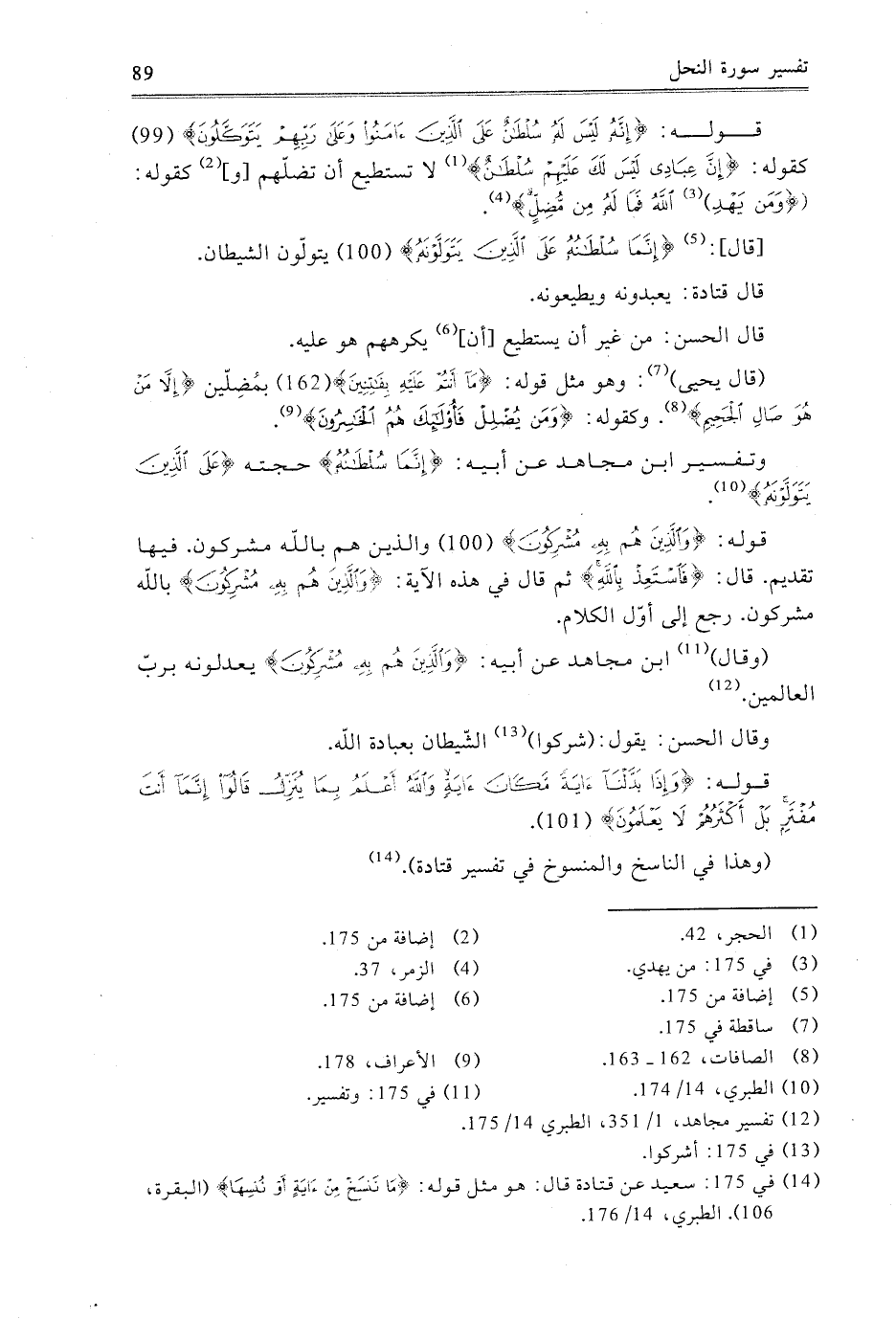 قَوْلُهُ: {إِنَّهُ لَيْسَ لَهُ سُلْطَانٌ عَلَى الَّذِينَ آمَنُوا وَعَلَى رَبِّهِمْ يَتَوَكَّلُونَ} [النحل: 99] كَقَوْلِهِ: {إِنَّ عِبَادِي لَيْسَ لَكَ عَلَيْهِمْ سُلْطَانٌ} [الحجر: 42] لا تَسْتَطِيعُ أَنْ تُضِلَّهُمْ، وَكَقَوْلِهِ: {وَمَنْ يَهْدِ اللَّهُ فَمَا لَهُ مِنْ مُضِلٍّ} [الزمر: 37] قَالَ: {إِنَّمَا سُلْطَانُهُ عَلَى الَّذِينَ يَتَوَلَّوْنَهُ} [النحل: 100] يَتَوَلَّوْنَ الشَّيْطَانَ.