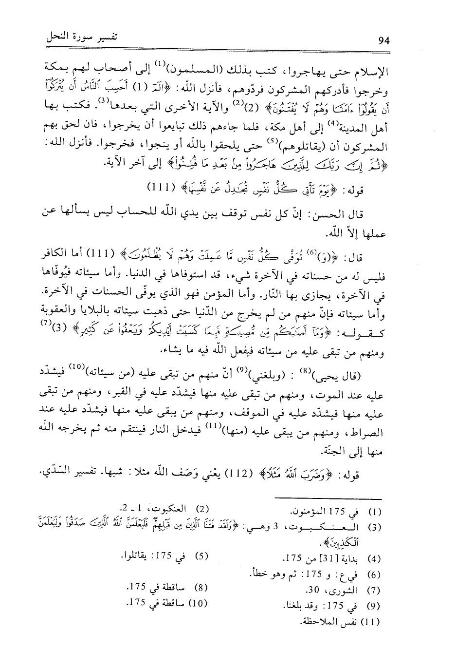 قَوْلُهُ: {يَوْمَ تَأْتِي كُلُّ نَفْسٍ تُجَادِلُ عَنْ نَفْسِهَا} [النحل: 111] قَالَ الْحَسَنُ: إِنَّ كُلُّ نَفْسٍ تُوقَفُ بَيْنَ يَدَيِ اللَّهِ لِلْحِسَابِ لَيْسَ يَسْأَلُهَا عَنْ عَمَلِهَا إِلا اللَّهُ.