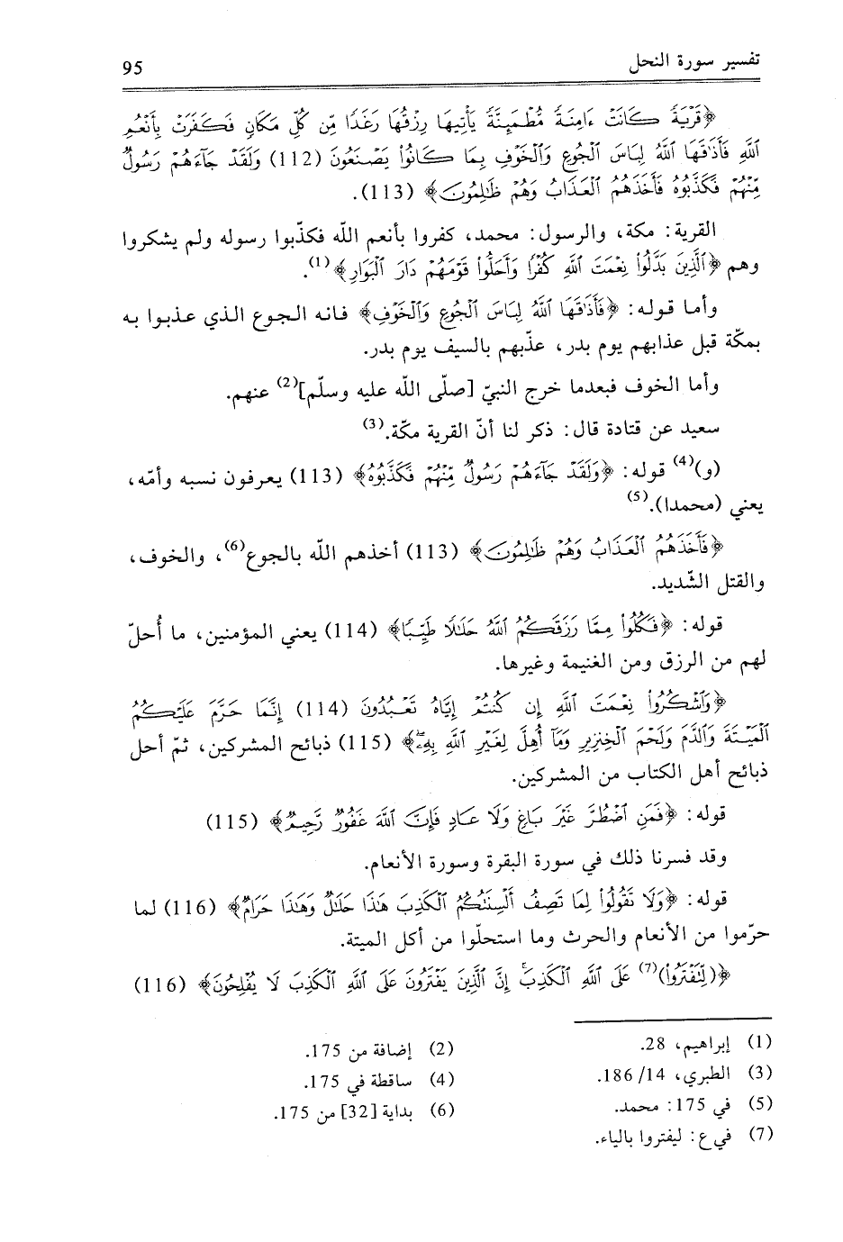 {قَرْيَةً كَانَتْ آمِنَةً مُطْمَئِنَّةً يَأْتِيهَا رِزْقُهَا رَغَدًا مِنْ كُلِّ مَكَانٍ فَكَفَرَتْ بِأَنْعُمِ اللَّهِ فَأَذَاقَهَا اللَّهُ لِبَاسَ الْجُوعِ وَالْخَوْفِ بِمَا كَانُوا يَصْنَعُونَ {112} وَلَقَدْ جَاءَهُمْ رَسُولٌ مِنْهُمْ فَكَذَّبُوهُ فَأَخَذَهُمُ الْعَذَابُ وَهُمْ ظَالِمُونَ {113} } [النحل: 112-113] الْقَرْيَةُ: مَكَّةُ، وَالرَّسُولُ: مُحَمَّدٌ، كَفَرُوا بِأَنْعُمِ اللَّهِ فَكَذَّبُوا رَسُولَهُ وَلَمْ يَشْكُرُوا وَهُمْ {الَّذِينَ بَدَّلُوا نِعْمَتَ اللَّهِ كُفْرًا وَأَحَلُّوا قَوْمَهُمْ دَارَ الْبَوَارِ} [إبراهيم: 28] .