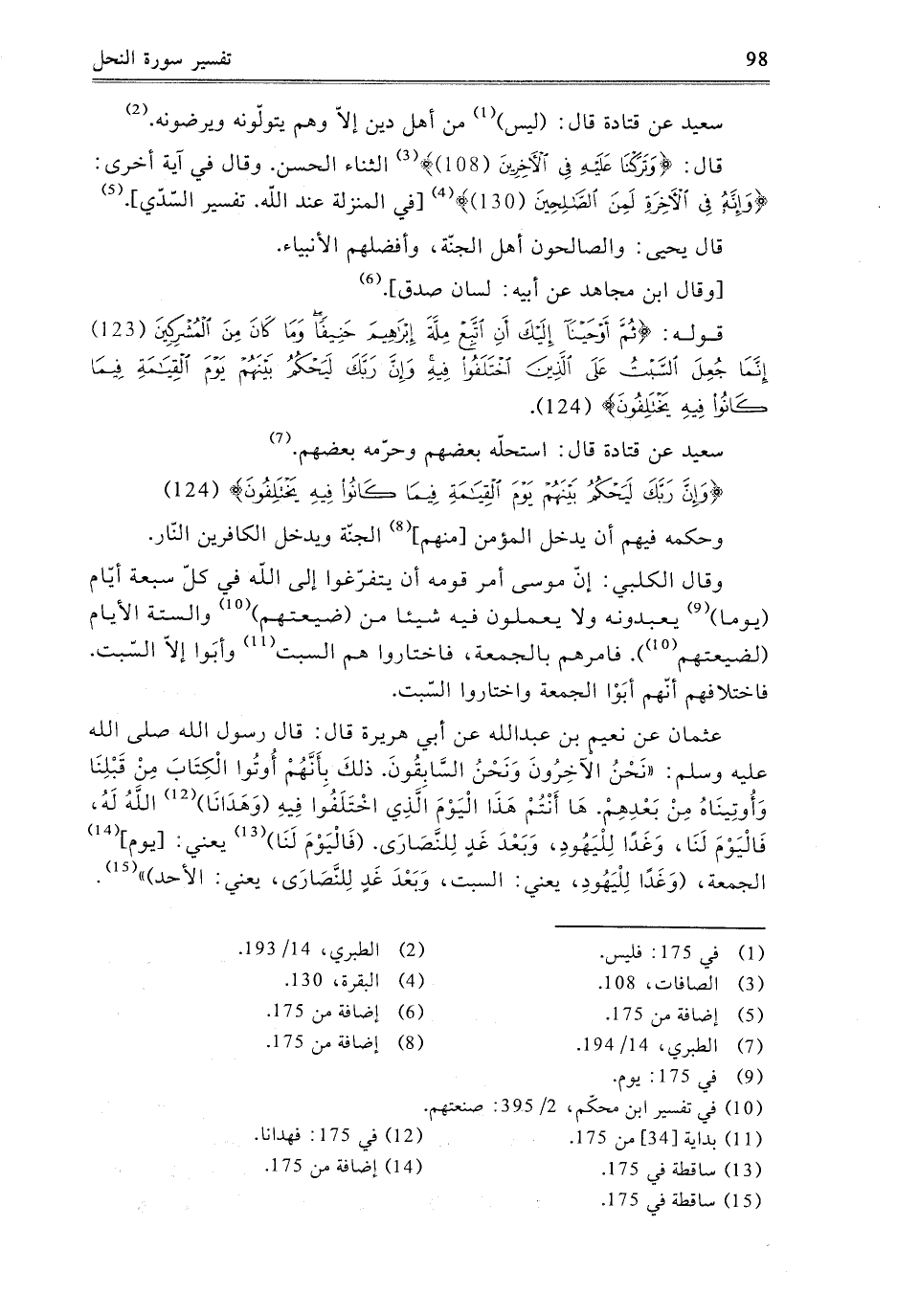 قَوْلُهُ: {ثُمَّ أَوْحَيْنَا إِلَيْكَ أَنِ اتَّبِعْ مِلَّةَ إِبْرَاهِيمَ حَنِيفًا وَمَا كَانَ مِنَ الْمُشْرِكِينَ {123} إِنَّمَا جُعِلَ السَّبْتُ عَلَى الَّذِينَ اخْتَلَفُوا فِيهِ وَإِنَّ رَبَّكَ لَيَحْكُمُ بَيْنَهُمْ يَوْمَ الْقِيَامَةِ فِيمَا كَانُوا فِيهِ يَخْتَلِفُونَ {124} } [النحل: 123-124] سَعِيدٌ، عَنْ قَتَادَةَ، قَالَ: اسْتَحَلَّهُ بَعْضُهُمْ، وَحَرَّمَهُ بَعْضُهُمْ.