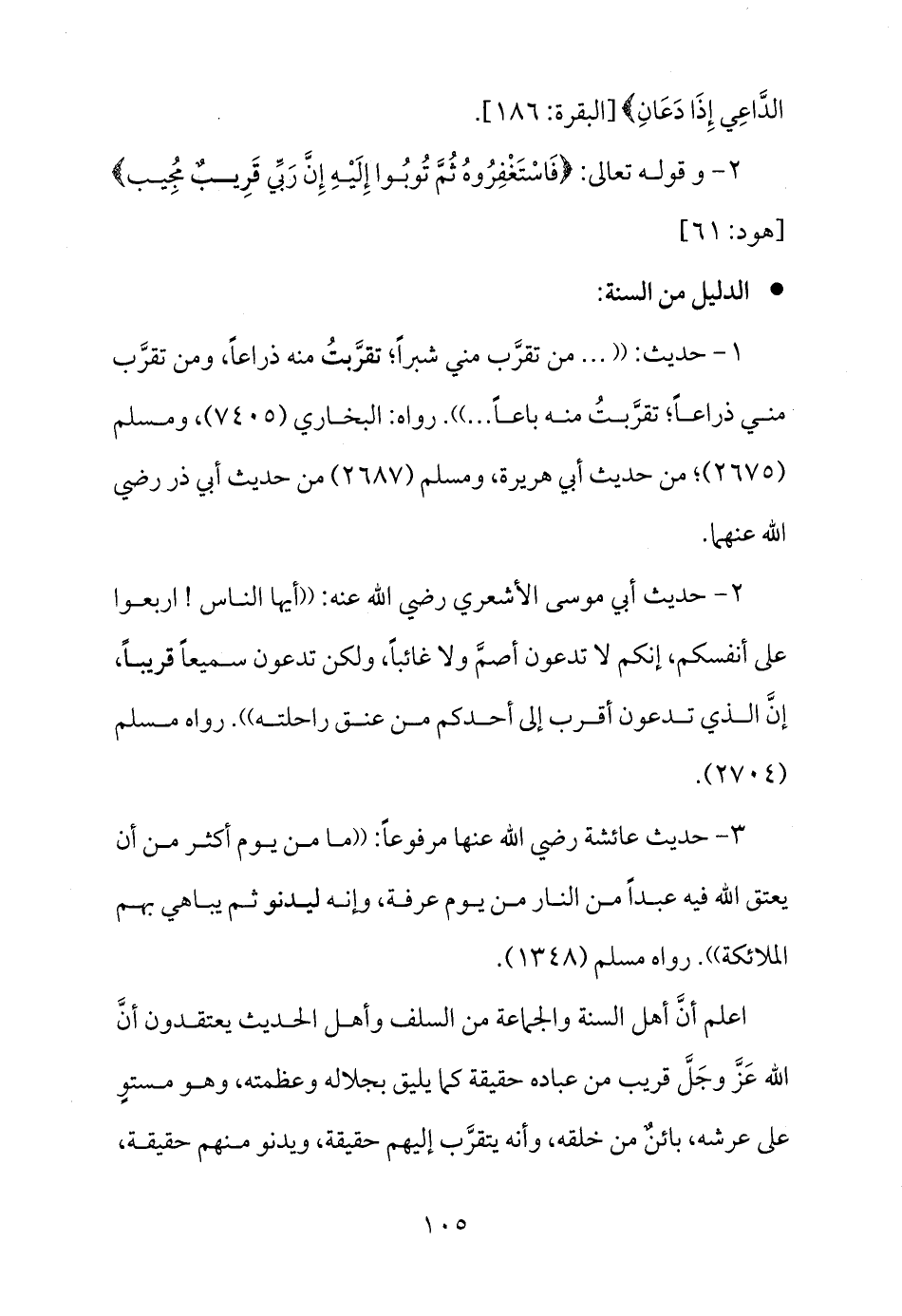 اعلم أنَّ أهل السنة والجماعة من السلف وأهل الحديث يعتقدون أنَّ الله عَزَّ وجَلَّ قريب من عباده حقيقة كما يليق بجلاله وعظمته، وهو مستوٍ على عرشه، بائنٌ من خلقه، وأنه يتقرَّب إليهم حقيقة، ويدنو منهم حقيقة،