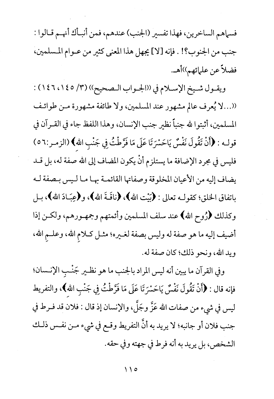 ويقول شيخ الإسلام في ((الجواب الصحيح)) (3/145، 146) : (( ... لا يُعرف عالم مشهور عند المسلمين، ولا طائفة مشهورة من طوائف المسلمين، أثبتوا لله جنباً نظير جنب الإنسان، وهذا اللفظ جاء في القرآن في قوله: {أَنْ تَقُولَ نَفْسٌ يَاحَسْرَتَا عَلَى مَا فَرَّطْتُ فِي جَنْبِ اللهِ} (الزمر:56) فليس في مجرد الإضافة ما يستلزم أنَّ يكون المضاف إلى الله صفة له، بل قد يضاف إليه من الأعيان المخلوقة وصفاتها القائمة بها ما ليس بصفة له باتفاق الخلق؛ كقوله تعالى: {بَيْت الله} ، {ناقَة الله} ، و {عِبَاد الله} ، بل وكذلك {رُوح الله} عند سلف المسلمين وأئمتهم وجمهورهم، ولكن؛ إذا أضيف إليه ما هو صفة له وليس بصفة لغيره؛ مثل كلام الله، وعلم الله، ويد الله، ونحو ذلك؛ كان صفة له.
