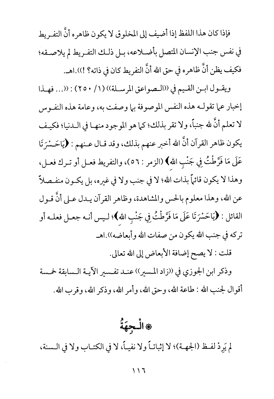 ويقول ابن القيم في ((الصواعق المرسلة)) (1/250) : (( ... فهذا إخبار عما تقوله هذه النفس الموصوفة بما وصفت به، وعامة هذه النفوس لا تعلم أنَّ لله جنباً، ولا تقر بذلك؛ كما هو الموجود منها في الدنيا؛ فكيف يكون ظاهر القرآن أنَّ الله أخبر عنهم بذلك، وقد قال عنهم: {يَاحَسْرَتَا عَلَى مَا فَرَّطْتُ فِي جَنْبِ اللهِ} (الزمر: 56) ، والتفريط فعل أو ترك فعل، وهذا لا يكون قائماً بذات الله؛ لا في جنب ولا في غيره، بل يكون منفصلاً عن الله، وهذا معلوم بالحس والمشاهدة، وظاهر القرآن يدل على أنَّ قول القائل: {يَاحَسْرَتَا عَلَى مَا فَرَّطْتُ فِي جَنْبِ اللهِ} ؛ ليس أنه جعل فعله أو تركه في جنب يكون من صفات الله وأبعاضه)) .اهـ