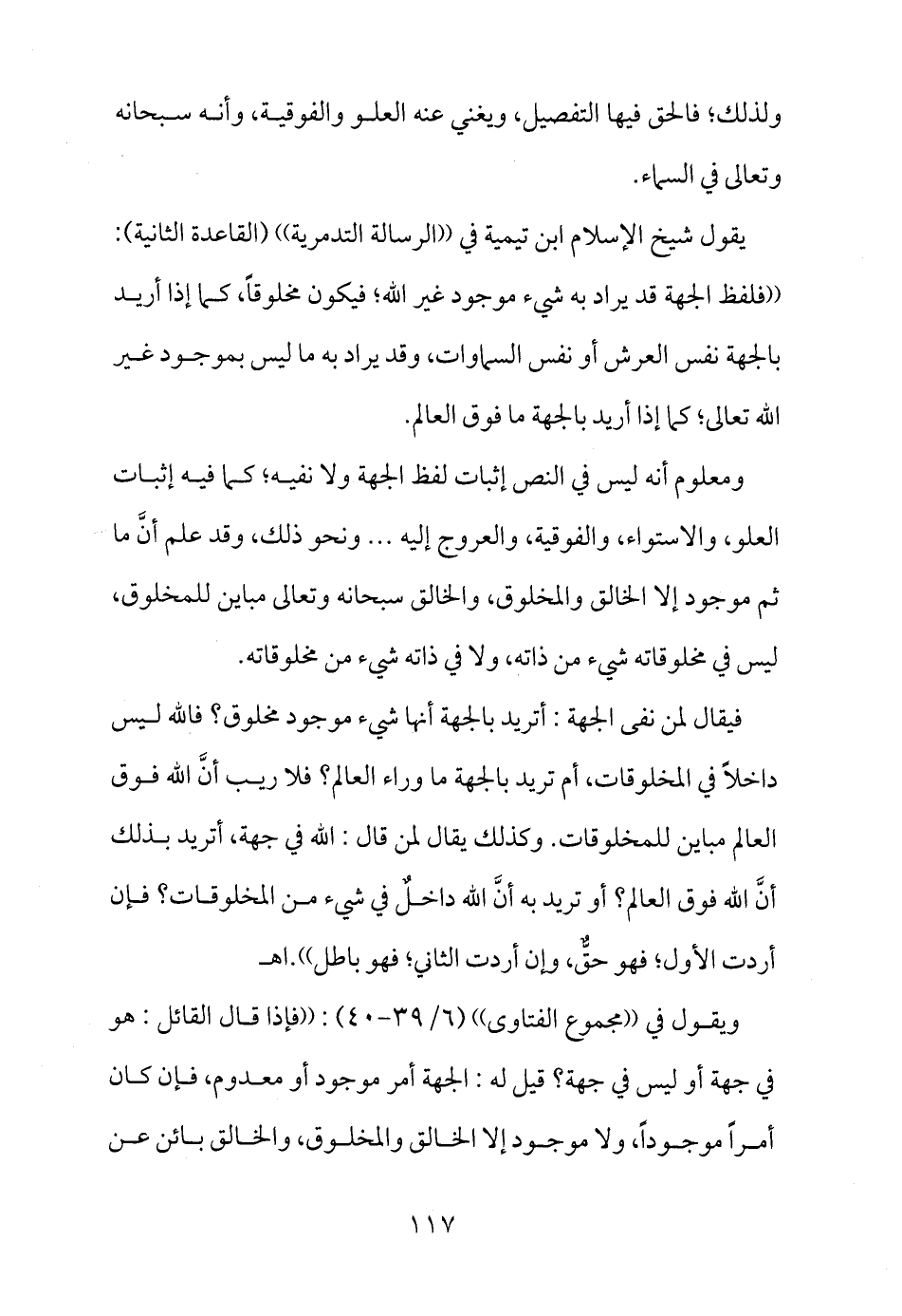 ومعلوم أنه ليس في النص إثبات لفظ الجهة ولا نفيه؛ كما فيه إثبات العلو، والاستواء، والفوقية، والعروج إليه ... ونحو ذلك، وقد علم أنَّ ما ثم موجود إلا الخالق والمخلوق، والخالق سبحانه وتعالى مباين للمخلوق، ليس في مخلوقاته شيء من ذاته، ولا في ذاته شيء من مخلوقاته.