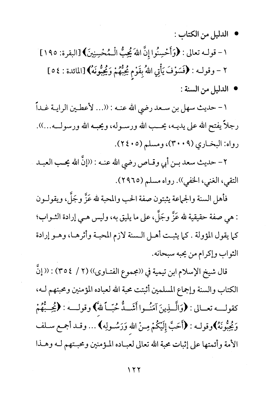 قال شيخ الإسلام ابن تيمية في ((مجموع الفتاوى)) (2 / 354) : ((إنَّ الكتاب والسنة وإجماع المسلمين أثبتت محبة الله لعباده المؤمنين ومحبتهم له، كقوله تعالى: {وَالَّذِينَ آمَنُوا أَشَدُّ حُبّاً لِلَّهِ} وقوله: {يُحِبُّهُمْ وَيُحِبُّونَهُ} وقوله: {أَحَبَّ إِلَيْكُمْ مِنْ اللهِ وَرَسُولِه} ... وقد أجمع سلف الامة وأئمتها على إثبات محبة الله تعالى لعباده المؤمنين ومحبتهم له وهذا