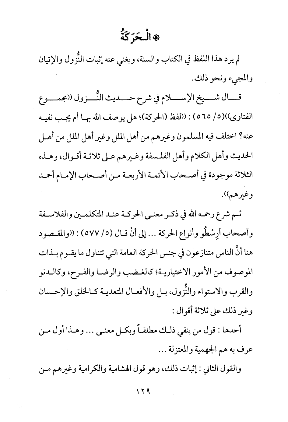 قال شيخ الإسلام في شرح حديث النُّزول ((مجموع الفتاوى)) (5/565) : ((لفظ (الحركة) ؛ هل يوصف الله بها أم يجب نفيه عنه؟ اختلف فيه المسلمون وغيرهم من أهل الملل وغير أهل الملل من أهل الحديث وأهل الكلام وأهل الفلسفة وغيرهم على ثلاثة أقوال، وهذه الثلاثة موجودة في أصحاب الآئمة الأربعة من أصحاب الإمام أحمد وغيرهم)) .