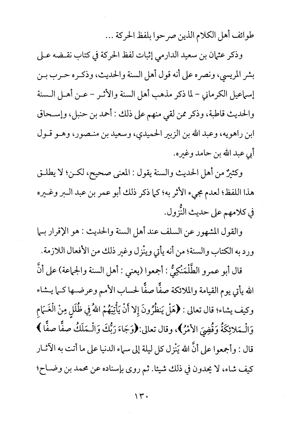 قال أبو عمرو الطَّلْمَنْكِيُّ: أجمعوا (يعني: أهل السنة والجماعة) على أنَّ الله يأتي يوم القيامة والملائكة صفَّاً صفَّاً لحساب الأمم وعرضها كما يشاء وكيف يشاء؛ قال تعالى: {هَلْ يَنظُرُونَ إِلا أَنْ يَأْتِيَهُمْ اللهُ فِي ظُلَلٍ مِنْ الْغَمَامِ وَالْمَلائِكَةُ وَقُضِيَ الأمْرُ} ، وقال تعالى: {وَجَاءَ رَبُّكَ وَالْمَلَكُ صَفَّاً صَفَّاً} . قال: وأجمعوا على أنَّ الله يَنْزل كل ليلة إلى سماء الدنيا على ما أتت به الآثار كيف شاء، لا يحدون في ذلك شيئا. ثم روى بإسناده عن محمد بن وضاح؛