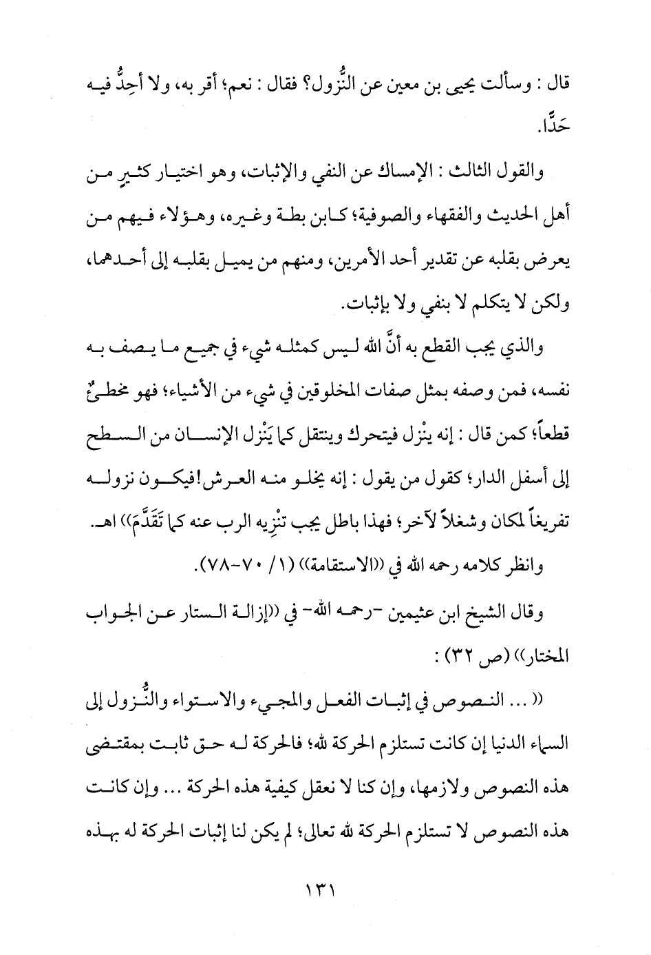 (( ... النصوص في إثبات الفعل والمجيء والاستواء والنُّزول إلى السماء الدنيا إن كانت تستلزم الحركة لله؛ فالحركة له حق ثابت بمقتضى هذه النصوص ولازمها، وإن كنا لا نعقل كيفية هذه الحركة ... وإن كانت هذه النصوص لا تستلزم الحركة لله تعالى؛ لم يكن لنا إثبات الحركة له بهذه