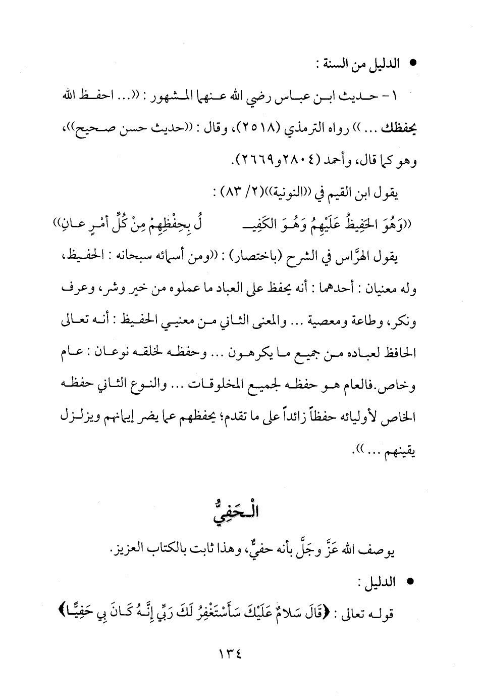يقول الهرَّاس في الشرح (باختصار) : ((ومن أسمائه سبحانه: الحفيظ، وله معنيان: أحدهما: أنه يحفظ على العباد ما عملوه من خير وشر، وعرف ونكر، وطاعة ومعصية ... والمعنى الثاني من معنيي الحفيظ: أنه تعالى الحافظ لعباده من جميع ما يكرهون ... وحفظه لخلقه نوعان: عام وخاص. فالعام هو حفظه لجميع المخلوقات ... والنوع الثاني حفظه الخاص لأوليائه حفظاً زائداً على ما تقدم؛ يحفظهم عما يضر إيمانهم ويزلزل يقينهم ... )) .