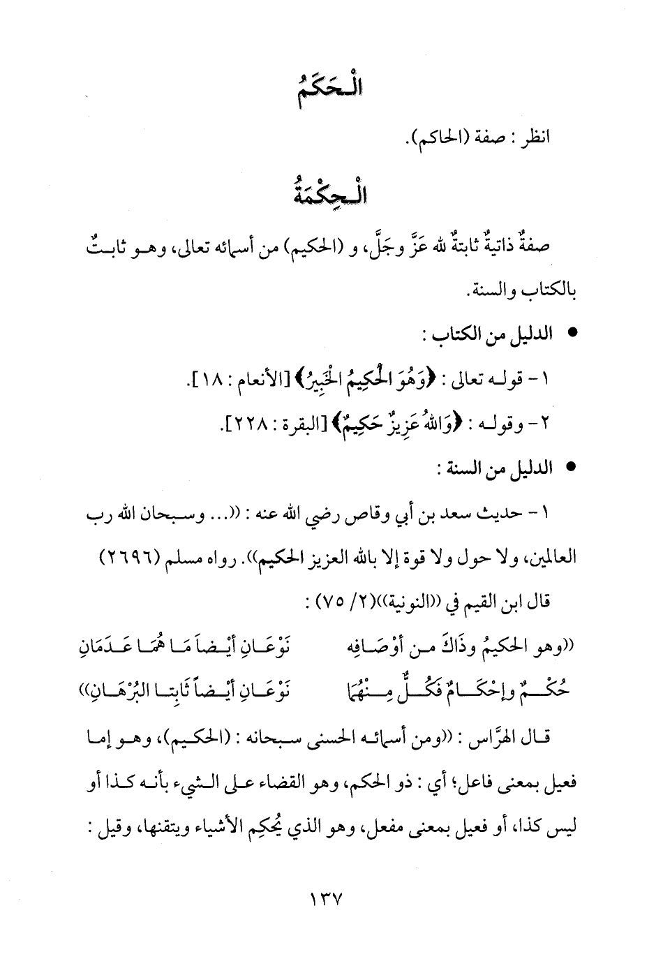 صفةٌ ذاتيةٌ ثابتةٌ لله عَزَّ وجَلَّ، و (الحكيم) من أسمائه تعالى، وهو ثابتٌ بالكتاب والسنة.