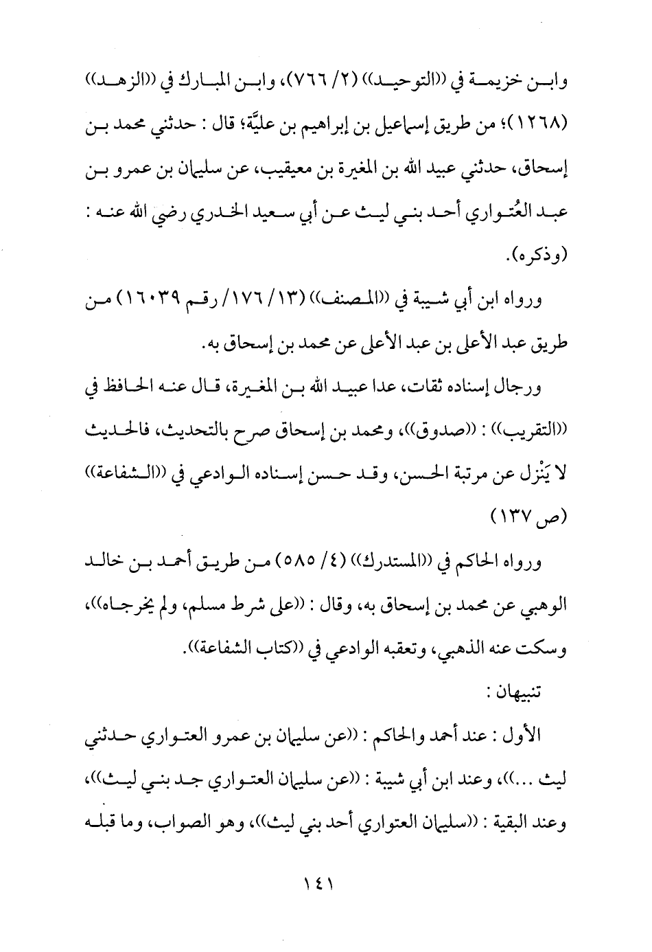 وابن خزيمة في ((التوحيد)) (2/766) ، وابن المبارك في ((الزهد)) (1268) ؛ من طريق إسماعيل بن إبراهيم بن عليَّة؛ قال: حدثني محمد بن إسحاق، حدثني عبيد الله بن المغيرة بن معيقيب، عن سليمان بن عمرو بن عبد العُتواري أحد بني ليث عن أبي سعيد الخدري رضي الله عنه: (وذكره) .