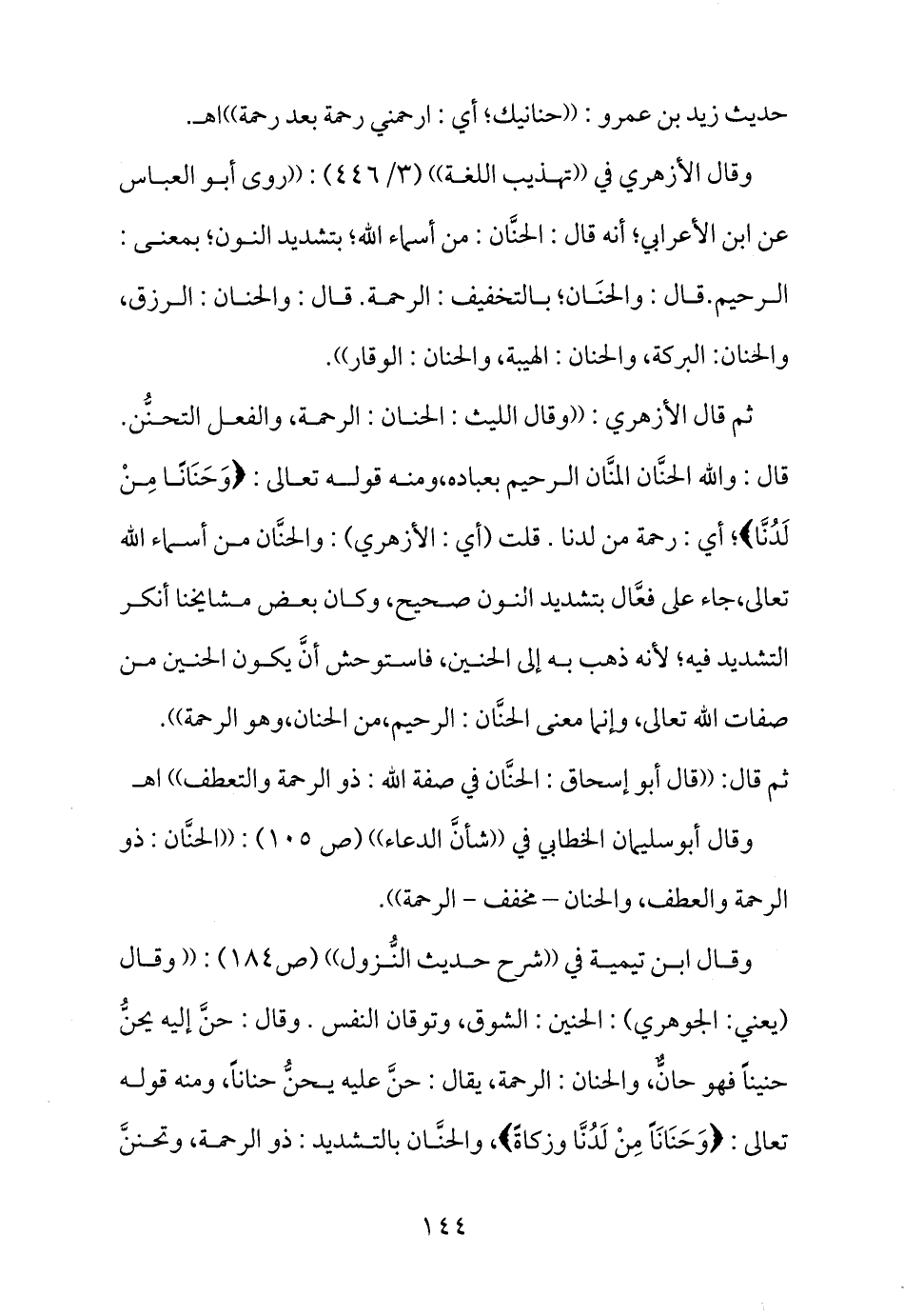 ثم قال الأزهري: ((وقال الليث: الحنان: الرحمة، والفعل التحنُّن. قال: والله الحنَّان المنَّان الرحيم بعباده، ومنه قوله تعالى: {وَحَنَانًا مِنْ لَدُنَّا} ؛ أي: رحمة من لدنا. قلت (أي: الأزهري) : والحنَّان من أسماء الله تعالى، جاء على فعَّال بتشديد النون صحيح، وكان بعض مشايخنا أنكر التشديد فيه؛ لأنه ذهب به إلى الحنين، فاستوحش أنَّ يكون الحنين من صفات الله تعالى، وإنما معنى الحنَّان: الرحيم، من الحنان، وهو الرحمة)) .
