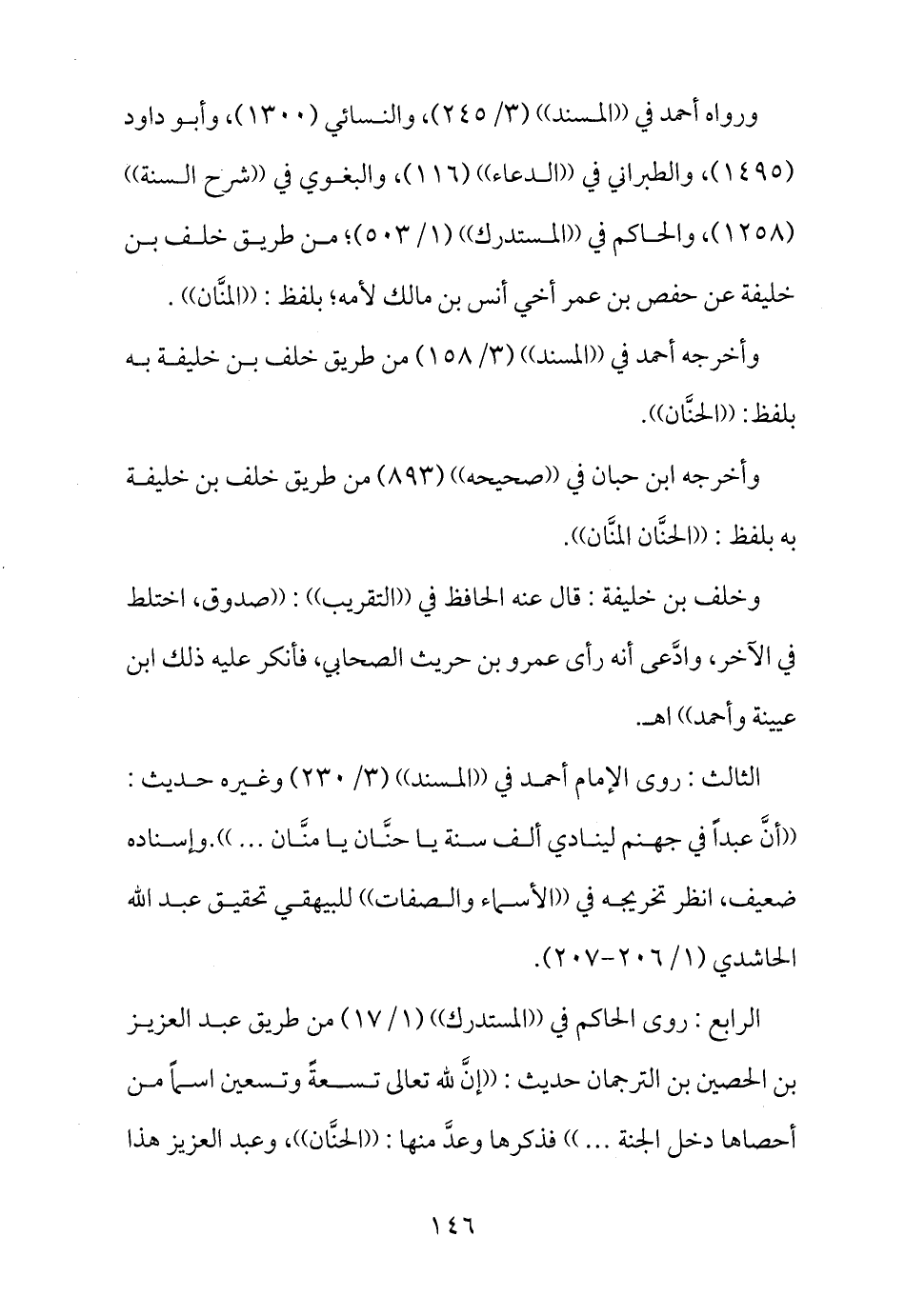 الرابع: روى الحاكم في ((المستدرك)) (1/17) من طريق عبد العزيز بن الحصين بن الترجمان حديث: ((إنَّ لله تعالى تسعةً وتسعين اسماً من أحصاها دخل الجنة ... )) فذكرها وعدَّ منها: ((الحنَّان)) ، وعبد العزيز هذا