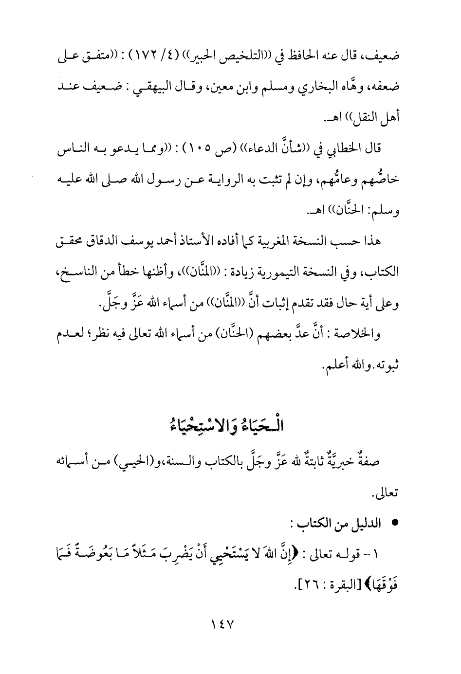 هذا حسب النسخة المغربية كما أفاده الأستاذ أحمد يوسف الدقاق محقق الكتاب، وفي النسخة التيمورية زيادة: ((المنَّان)) ، وأظنها خطأ من الناسخ، وعلى أية حال فقد تقدم إثبات أنَّ ((المنَّان)) من أسماء الله عَزَّ وجَلَّ.