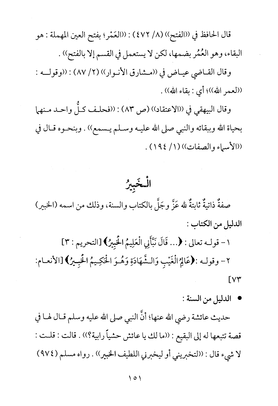 وقال البيهقي في ((الاعتقاد)) (ص 83) : ((فحلف كلُّ واحد منهما بحياة الله وببقائه والنبي صلى الله عليه وسلم يسمع)) . وبنحوه قال في ((الأسماء والصفات)) (1/194) .