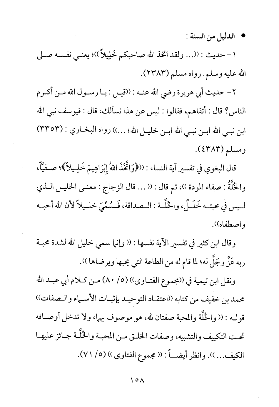 ونقل ابن تيمية في ((مجموع الفتاوى)) (5/80) من كلام أبي عبد الله محمد بن خفيف من كتابه ((اعتقاد التوحيد بإثبات الأسماء والصفات)) قوله: ((والخُلَّة والمحبة صفتان لله، هو موصوف بهما، ولا تدخل أوصافه تحت التكييف والتشبيه، وصفات الخلق من المحبة والخُلَّة جائز عليها الكيف ... )) . وانظر أيضاً: ((مجموع الفتاوى)) (5/71) .