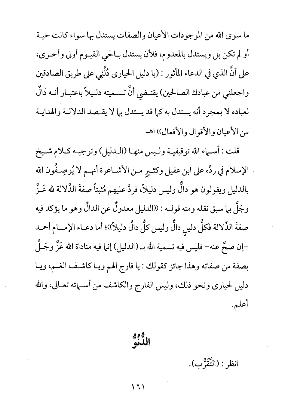 ما سوى الله من الموجودات الأعيان والصفات يستدل بها سواء كانت حية أو لم تكن بل ويستدل بالمعدوم، فلأن يستدل بالحي القيوم أولى وأحرى، على أنَّ الذي في الدعاء المأثور: (يا دليل الحيارى دُلَّنِي على طريق الصادقين واجعلني من عبادك الصالحين) يقتضي أنَّ تسميته دليلاً باعتبار أنه دالٌ لعباده لا بمجرد أنه يستدل به كما قد يستدل بما لا يقصد الدلالة والهداية من الأعيان والأقوال والأفعال)) اهـ