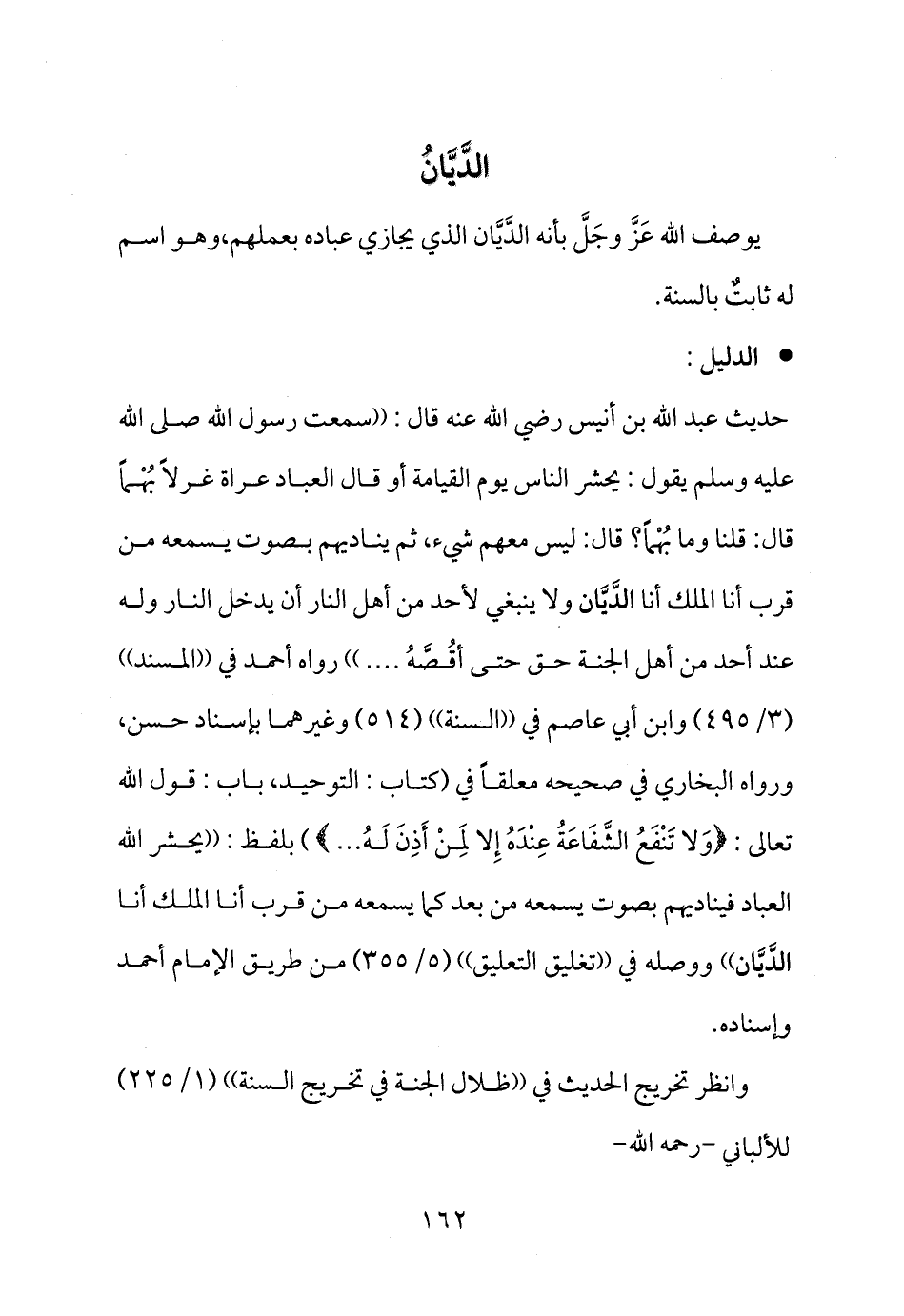 حديث عبد الله بن أنيس رضي الله عنه قال: ((سمعت رسول الله صلى الله عليه وسلم يقول: يحشر الناس يوم القيامة أو قال العباد عراة غرلاً بُهْمَاً قال قلنا وما بهما قال ليس معهم شيء ثم يناديهم بصوت يسمعه من قرب أنا الملك أنا الدَيَّان ولا ينبغي لأحد من أهل النار أن يدخل النار وله عند أحد من أهل الجنة حق حتى أقصه....)) رواه أحمد في ((المسند)) (3/495) وابن أبي عاصم في ((السنة)) (514) وغيرهما بإسناد حسن، ورواه البخاري في صحيحه معلقاً في (كتاب: التوحيد، باب: قول الله تعالى: {وَلا تَنْفَعُ الشَّفَاعَةُ عِنْدَهُ إِلا لِمَنْ أَذِنَ لَهُ..} ) بلفظ: ((يحشر الله العباد فيناديهم بصوت يسمعه من بعد كما يسمعه من قرب أنا الملك أنا الدَيَّان)) ووصله في ((تغليق التعليق)) (5/355) من طريق الإمام أحمد وإسناده.