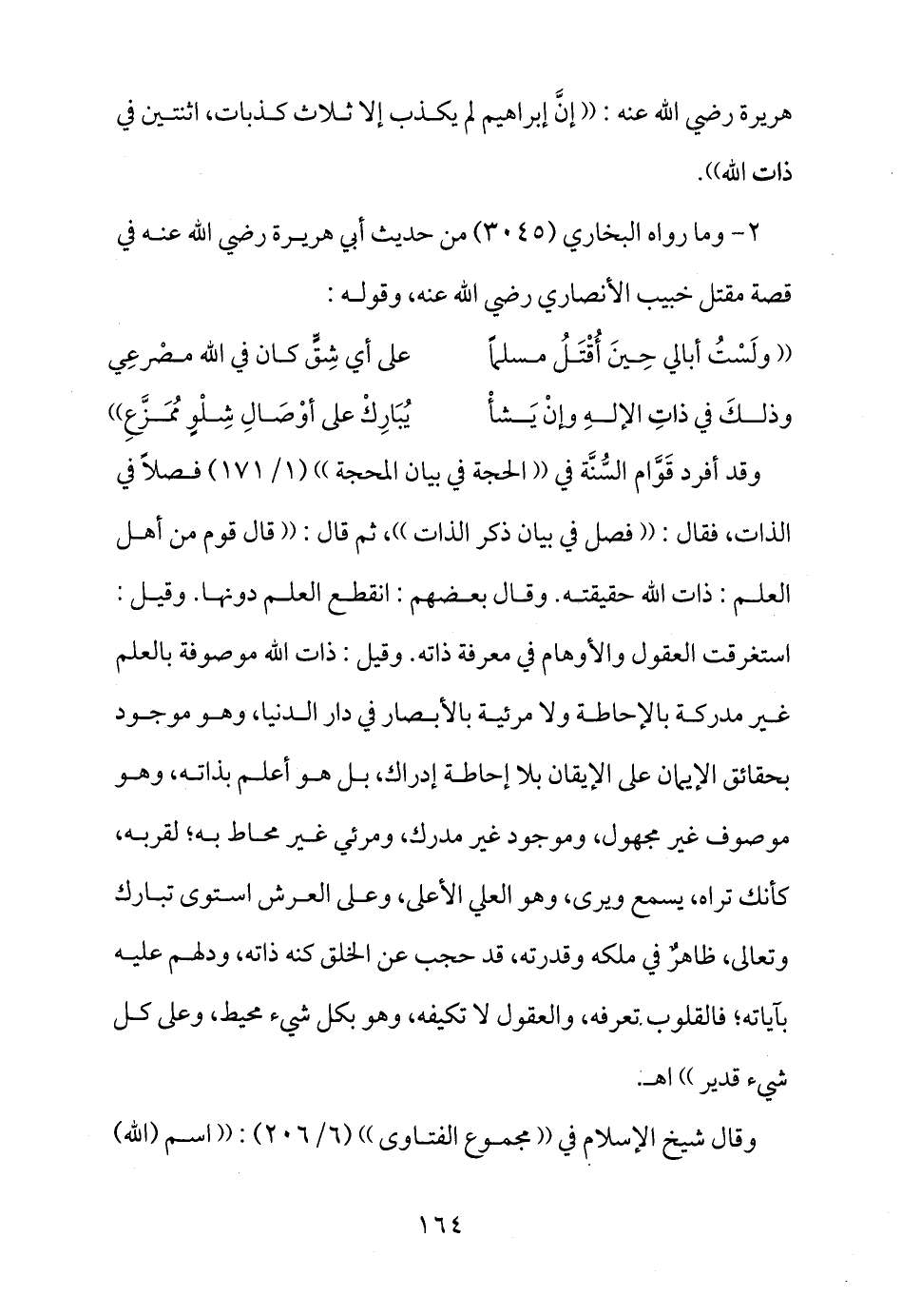 وقد أفرد قَوَّام السُّنَّة في ((الحجة في بيان المحجة)) (1/171) فصلاً في الذات، فقال: ((فصل في بيان ذكر الذات)) ، ثم قال: ((قال قوم من أهل العلم: ذات الله حقيقته. وقال بعضهم: انقطع العلم دونها. وقيل: استغرقت العقول والأوهام في معرفة ذاته. وقيل: ذات الله موصوفة بالعلم غير مدركة بالإحاطة ولا مرئية بالأبصار في دار الدنيا، وهو موجود بحقائق الإيمان على الإيقان بلا إحاطة إدراك، بل هو أعلم بذاته، وهو موصوف غير مجهول، وموجود غير مدرك، ومرئي غير محاط به؛ لقربه، كأنك تراه، يسمع ويرى، وهو العلي الأعلى، وعلى العرش استوى تبارك وتعالى، ظاهرٌ في ملكه وقدرته، قد حجب عن الخلق كنه ذاته، ودلهم عليه بآياته؛ فالقلوب تعرفه، والعقول لا تكيفه، وهو بكل شيء محيط، وعلى كل شيء قدير)) اهـ.
