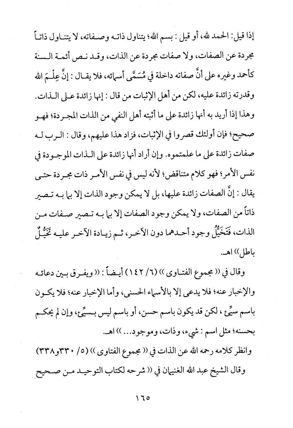 إذا قيل: الحمد لله، أو قيل: بسم الله؛ يتناول ذاته وصفاته، لا يتناول ذاتاً مجردة عن الصفات، ولا صفات مجردة عن الذات، وقد نص أئمة السنة كأحمد وغيره على أنَّ صفاته داخلة في مسمى أسمائه، فلا يقال: إنَّ علم الله وقدرته زائدة عليه، لكن من أهل الإثبات من قال: إنها زائدة على الذات. وهذا إذا أريد به أنها زائدة على ما أثبته أهل النفي من الذات المجردة؛ فهو صحيح؛ فإن أولئك قصروا في الإثبات، فزاد هذا عليهم، وقال: الرب له صفات زائدة على ما علمتموه. وإن أراد أنها زائدة على الذات الموجودة في نفس الأمر؛ فهو كلام متناقض؛ لأنه ليس في نفس الأمر ذات مجردة حتى يقال: إنَّ الصفات زائدة عليها، بل لا يمكن وجود الذات إلا بما به تصير ذاتاً من الصفات، ولا يمكن وجود الصفات إلا بما به تصير صفات من الذات، فتخيل وجود أحدهما دون الآخر، ثم زيادة الآخر عليه تخيل باطل)) اهـ.