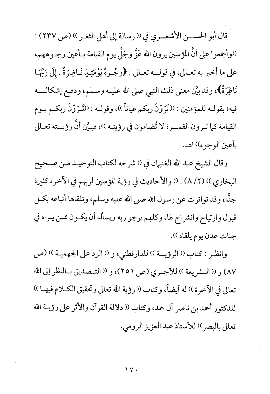 وقال الشيخ عبد الله الغنيمان في ((شرحه لكتاب التوحيد من صحيح البخاري)) (2/8) : ((والأحاديث في رؤية المؤمنين لربهم في الآخرة كثيرة جدّاً، وقد تواترت عن رسول الله صلى الله عليه وسلم، وتلقاها أتباعه بكل قبول وارتياح وانشراح لها، وكلهم يرجو ربه ويسأله أن يكون ممن يراه في جنات عدن يوم يلقاه)) .