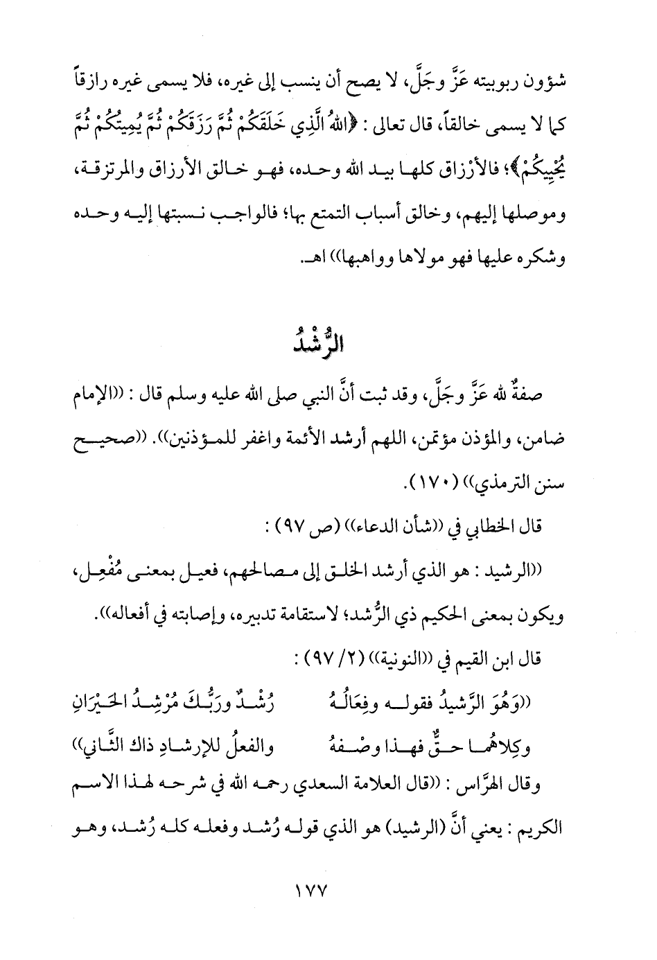 شؤون ربوبيته عَزَّ وجَلَّ، لا يصح أن ينسب إلى غيره، فلا يسمى غيره رازقاً كما لا يسمى خالقاً، قال تعالى: {اللهُ الَّذِي خَلَقَكُمْ ثُمَّ رَزَقَكُمْ ثُمَّ يُمِيتُكُمْ ثُمَّ يُحْيِيكُمْ} ؛ فالأرْزاق كلها بيد الله وحده، فهو خالق الأرزاق والمرتزقة، وموصلها إليهم، وخالق أسباب التمتع بها؛ فالواجب نسبتها إليه وحده وشكره عليها فهو مولاها وواهبها)) اهـ.