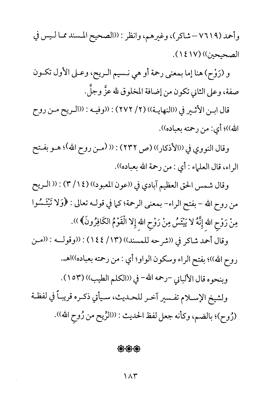وقال أحمد شاكر في ((شرحه للمسند)) (13/144) : ((وقوله: ((من روح الله)) ؛ بفتح الراء وسكون الواو؛ أي: من رحمته بعباده)) اهـ.