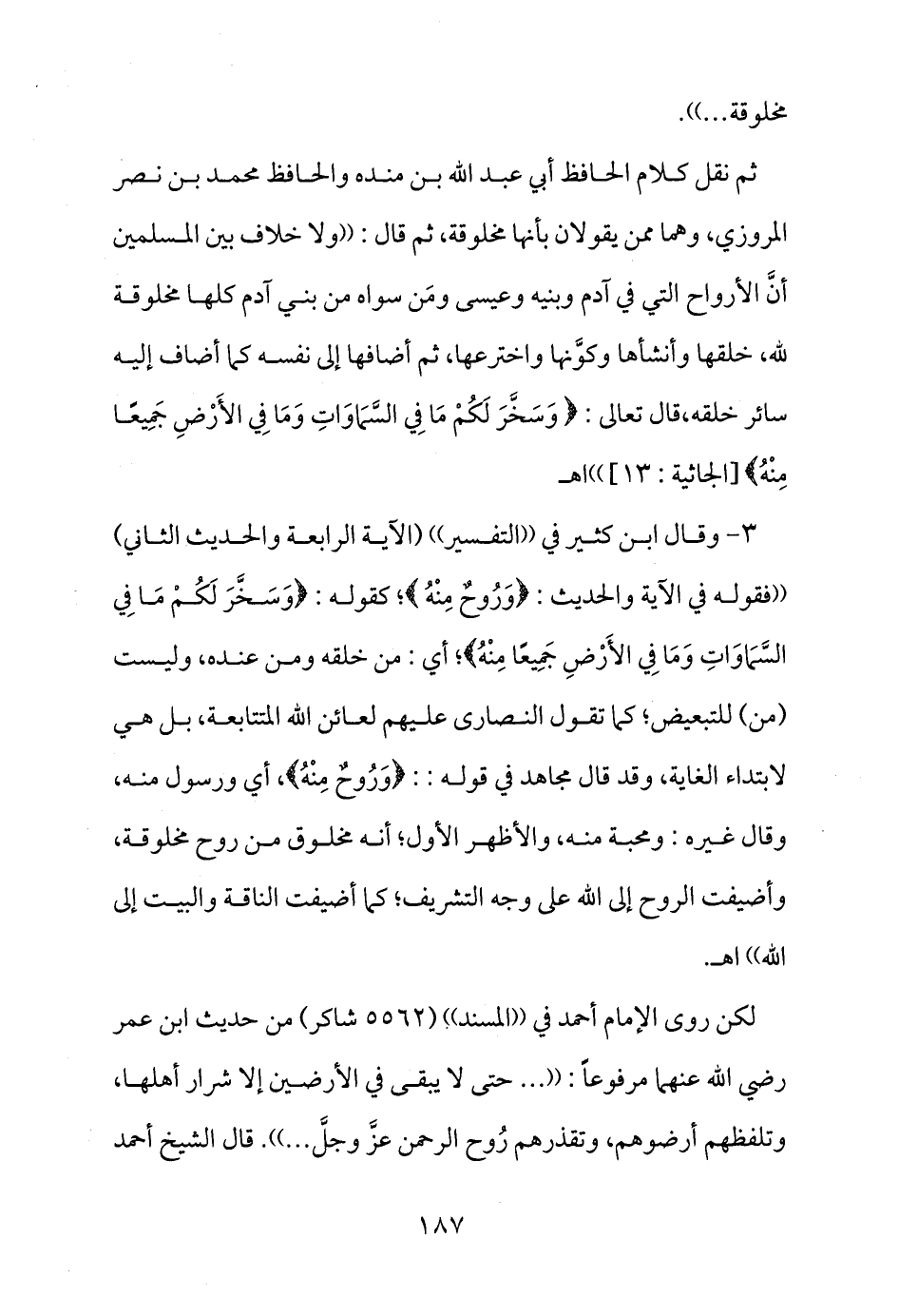ثم نقل كلام الحافظ أبي عبد الله بن منده والحافظ محمد بن نصر المروزي، وهما ممن يقولان بأنها مخلوقة، ثم قال: ((ولا خلاف بين المسلمين أنَّ الأرواح التي في آدم وبنيه وعيسى ومَن سواه من بني آدم كلها مخلوقة لله، خلقها وأنشأها وكوَّنها واخترعها، ثم أضافها إلى نفسه كما أضاف إليه سائر خلقه، قال تعالى: {وَسَخَّرَ لَكُمْ مَا فِي السَّمَاوَاتِ وَمَا فِي الأَرْضِ جَمِيعًا مِنْهُ} [الجاثية: 13] )) اهـ
