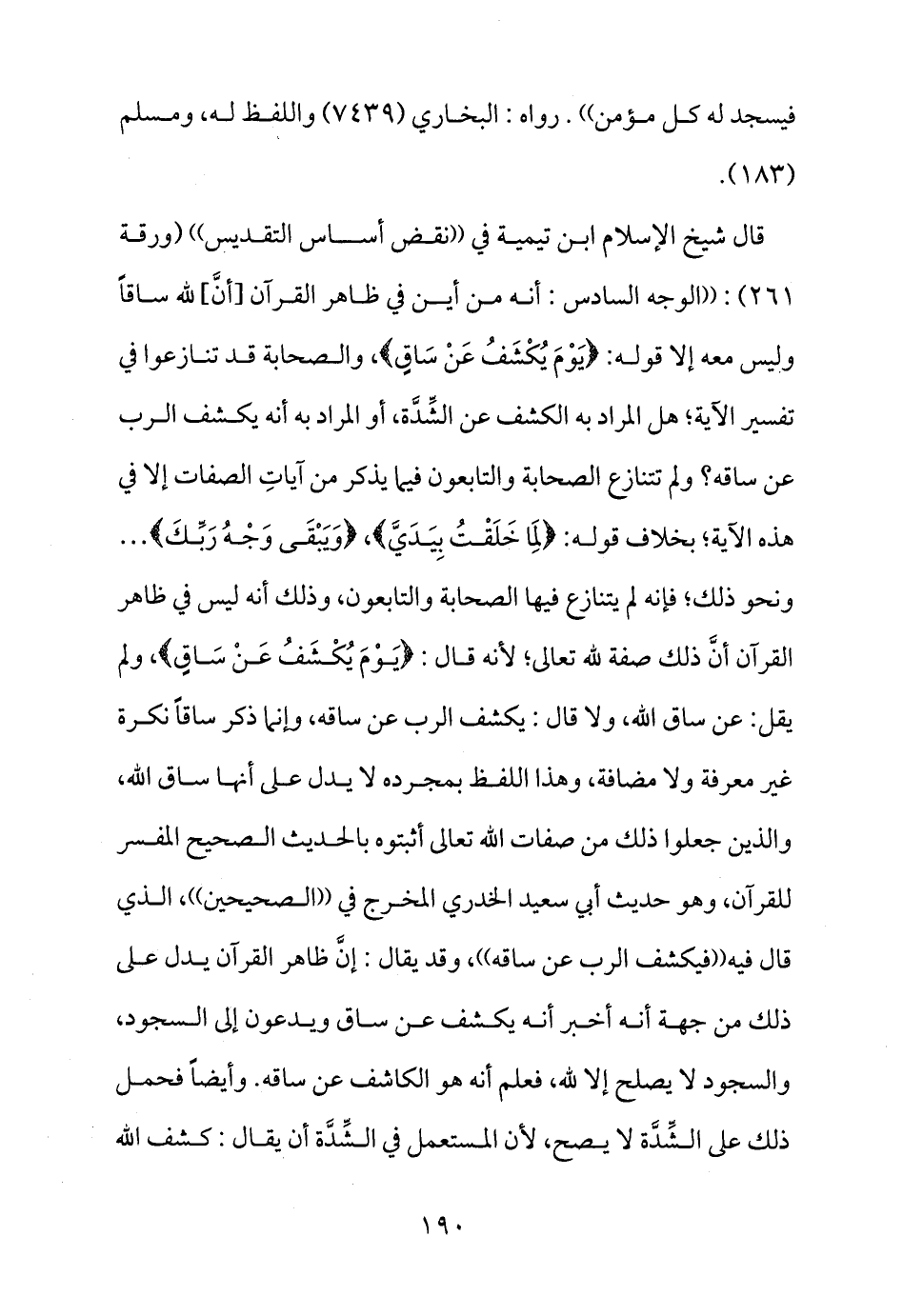 قال شيخ الإسلام ابن تيمية في ((نقض أساس التقديس)) (ورقة 261) : ((الوجه السادس: أنه من أين في ظاهر القرآن [أنَّ] لله ساقاً وليس معه إلا قوله: {يَوْمَ يُكْشَفُ عَنْ سَاقٍ} ، والصحابة قد تنازعوا في تفسير الآية؛ هل المراد به الكشف عن الشِّدَّة، أو المراد به أنه يكشف الرب عن ساقه؟ ولم تتنازع الصحابة والتابعون فيما يذكر من آياتِ الصفات إلا في هذه الآية؛ بخلاف قوله: {لِمَا خَلَقْتُ بِيَدَيَّ} ، {وَيَبْقَى وَجْهُ رَبِّكَ} ... ونحو ذلك؛ فإنه لم يتنازع فيها الصحابة والتابعون، وذلك أنه ليس في ظاهر القرآن أنَّ ذلك صفة لله تعالى؛ لأنه قال: {يَوْمَ يُكْشَفُ عَنْ سَاقٍ} ، ولم يقل: عن ساق الله، ولا قال: يكشف الرب عن ساقه، وإنما ذكر ساقاً نكرة غير معرفة ولا مضافة، وهذا اللفظ بمجرده لا يدل على أنها ساق الله، والذين جعلوا ذلك من صفات الله تعالى أثبتوه بالحديث الصحيح المفسر للقرآن، وهو حديث أبي سعيد الخدري المخرج في ((الصحيحين)) ، الذي قال فيه ((فيكشف الرب عن ساقه)) ، وقد يقال: إنَّ ظاهر القرآن يدل على ذلك من جهة أنه أخبر أنه يكشف عن ساق ويدعون إلى السجود، والسجود لا يصلح إلا لله، فعلم أنه هو الكاشف عن ساقه.