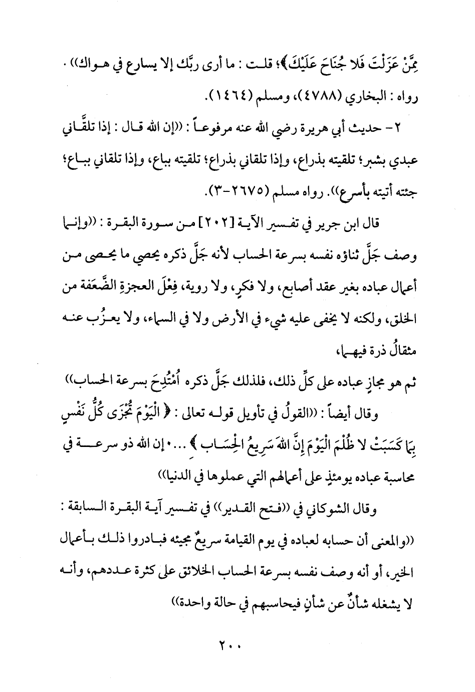 وقال الشوكاني في ((فتح القدير)) في تفسير آية البقرة السابقة: ((والمعنى أن حسابه لعباده في يوم القيامة سريعٌ مجيئه فبادروا ذلك بأعمال الخير، أو أنه وصف نفسه بسرعة الحساب الخلائق على كثرة عددهم، وأنه لا يشغله شأنٌ عن شأنٍ فيحاسبهم في حالة واحدة))