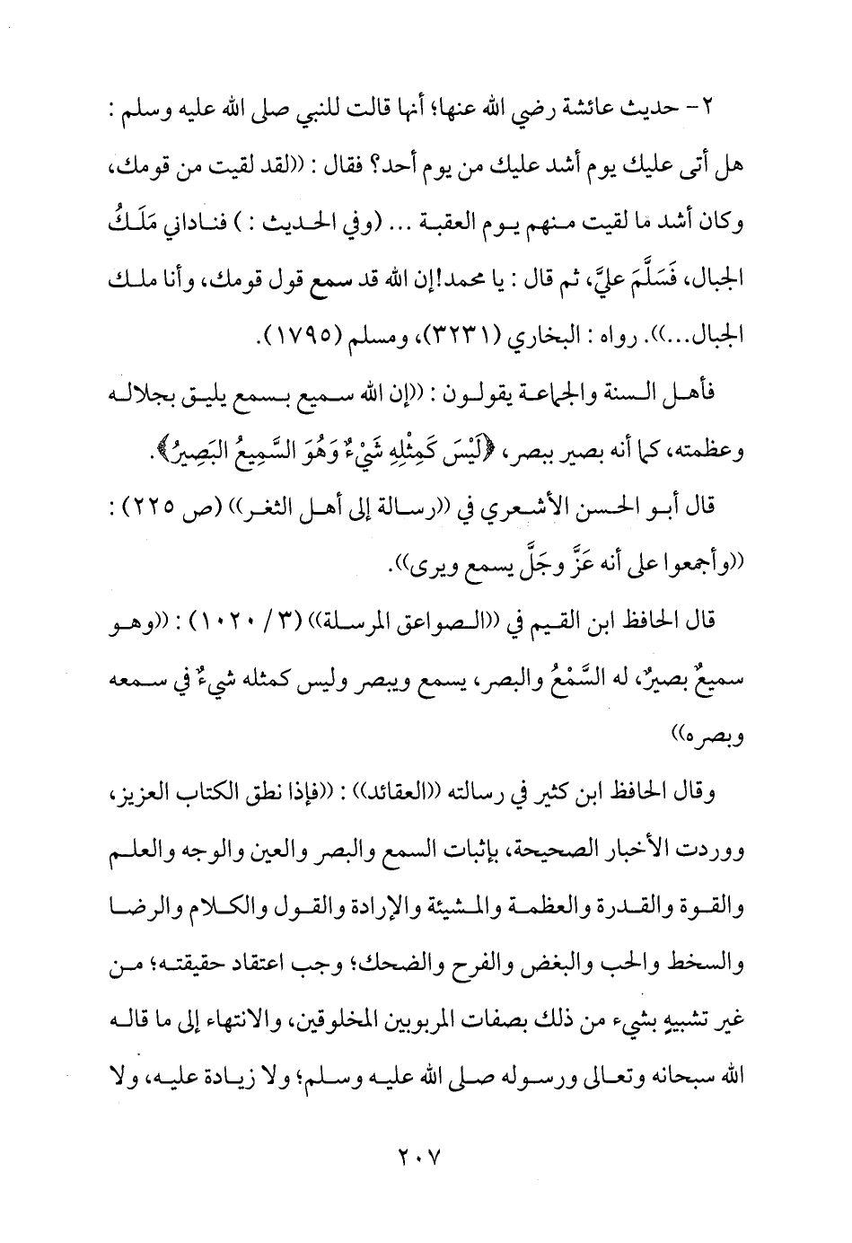 وقال الحافظ ابن كثير في رسالته ((العقائد)) : ((فإذا نطق الكتاب العزيز، ووردت الأخبار الصحيحة، بإثبات السمع والبصر والعين والوجه والعلم والقوة والقدرة والعظمة والمشيئة والإرادة والقول والكلام والرضى والسخط والحب والبغض والفرح والضحك؛ وجب اعتقاد حقيقته؛ من غير تشبيهٍ بشيء من ذلك بصفات المربوبين المخلوقين، والانتهاء إلى ما قاله الله سبحانه وتعالى ورسوله صلى الله عليه وسلم؛ ولا زيادة عليه، ولا