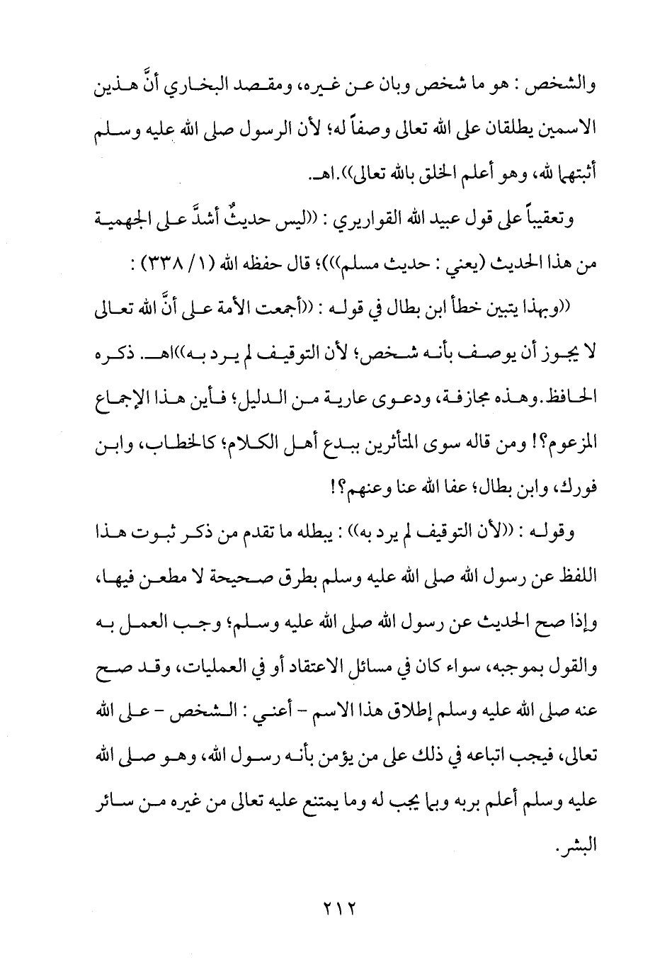 وقوله: ((لأن التوقيف لم يرد به)) : يبطله ما تقدم من ذكر ثبوت هذا اللفظ عن رسول الله صلى الله عليه وسلم بطرق صحيحة لا مطعن فيها، وإذا صح الحديث عن رسول الله صلى الله عليه وسلم؛ وجب العمل به والقول بموجبه، سواء كان في مسائل الاعتقاد أو في العمليات، وقد صح عنه صلى الله عليه وسلم إطلاق هذا الاسم - أعني: الشخص - على الله تعالى، فيجب اتباعه في ذلك على من يؤمن بأنه رسول الله، وهو صلى الله عليه وسلم أعلم بربه وبما يجب له وما يمتنع عليه تعالى من غيره من سائر البشر.
