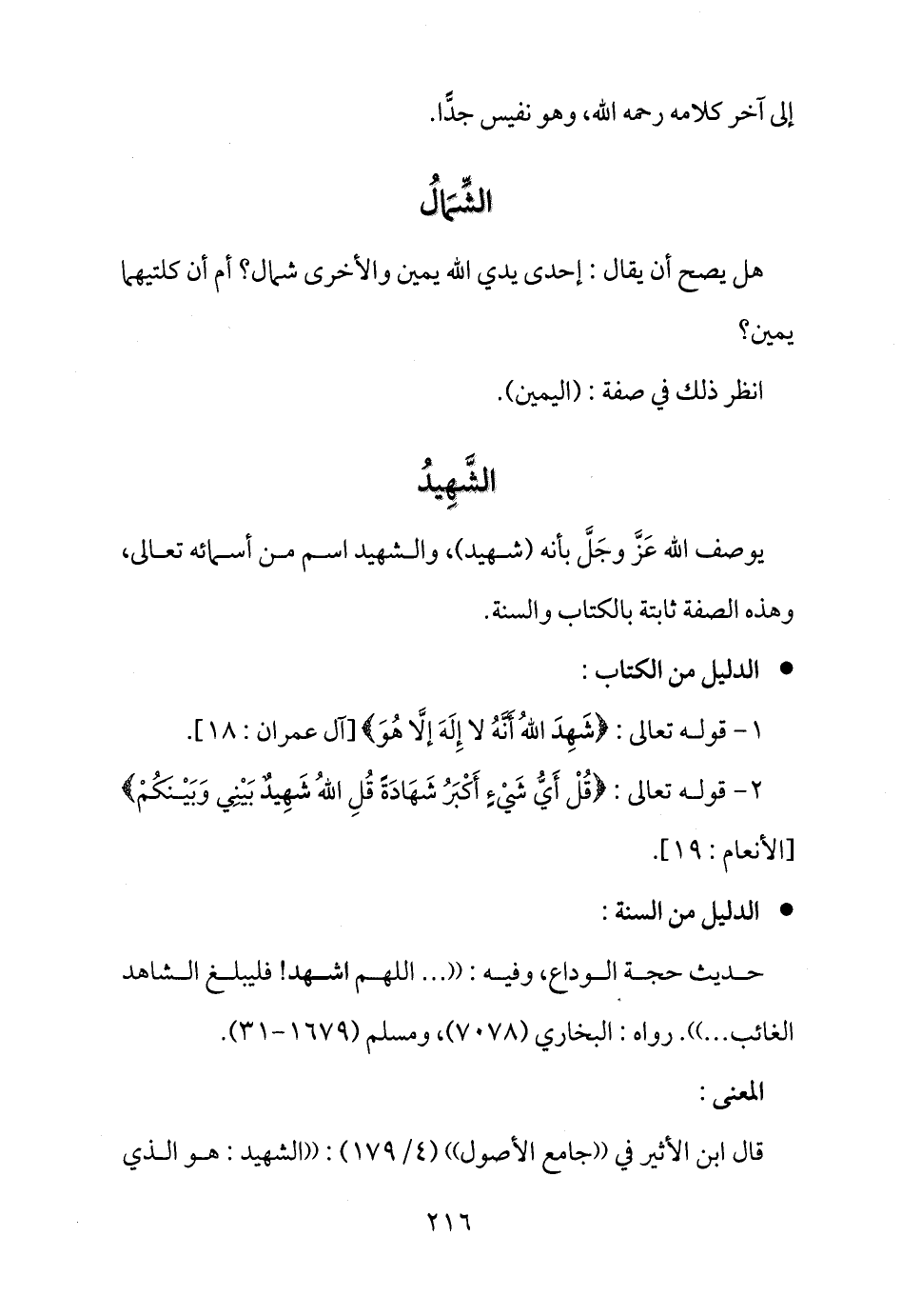 يوصف الله عَزَّ وجَلَّ بأنه (شهيد) ، والشهيد اسم من أسمائه تعالى، وهذه الصفة ثابتة بالكتاب والسنة.
