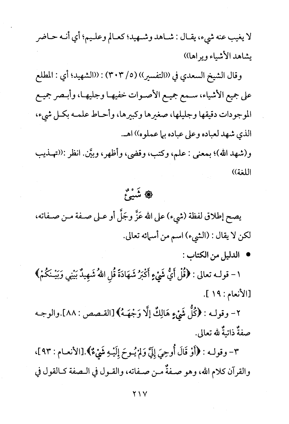يصح إطلاق لفظة (شيء) على الله عَزَّ وجَلَّ أو على صفة من صفاته، لكن لا يقال: (الشيء) اسم من أسمائه تعالى.