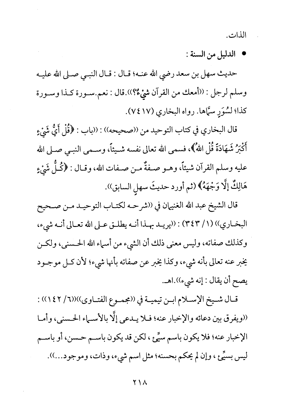 قال البخاري في كتاب التوحيد من ((صحيحه)) : ((باب: {قُلْ أَيُّ شَيْءٍ أَكْبَرُ شَهَادَةً قُلْ اللهُ} ، فسمى الله تعالى نفسه شيئاً، وسمى النبي صلى الله عليه وسلم القرآن شيئاً، وهو صفةٌ من صفات الله، وقال: {كُلُّ شَيْءٍ هَالِكٌ إِلاَّ وَجْهَهُ} (ثم أورد حديثَ سهلٍ السابق)) .