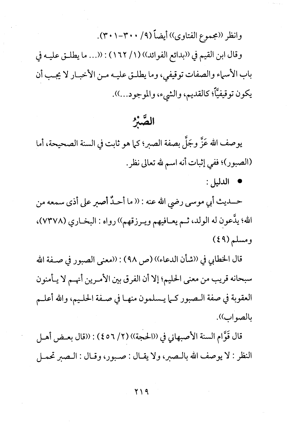 قال قَوَّام السنة الأصبهاني في ((الحجة)) (2/456) : ((قال بعض أهل النظر: لا يوصف الله بالصبر، ولا يقال: صبور، وقال: الصبر تحمل